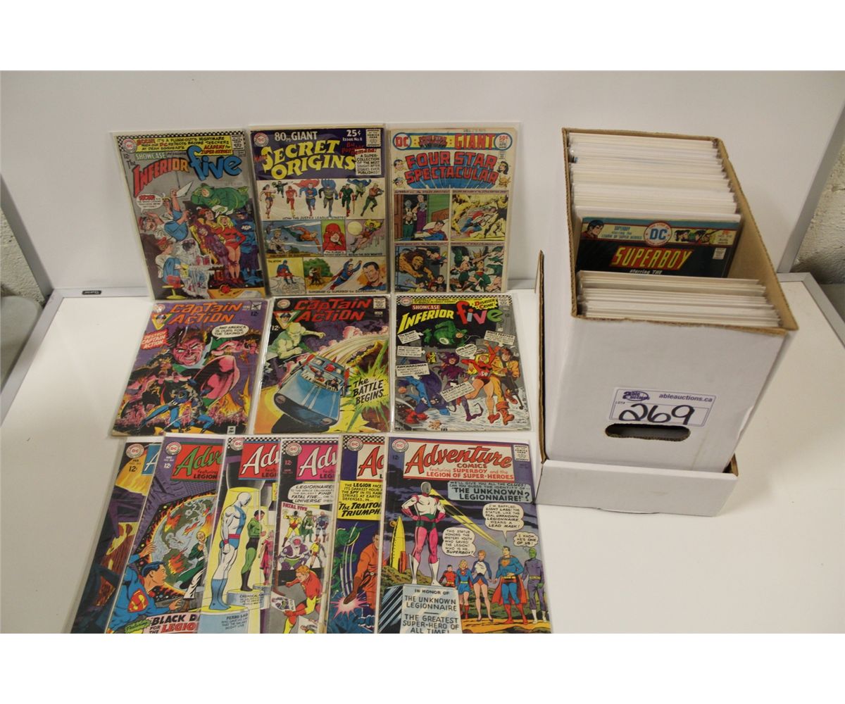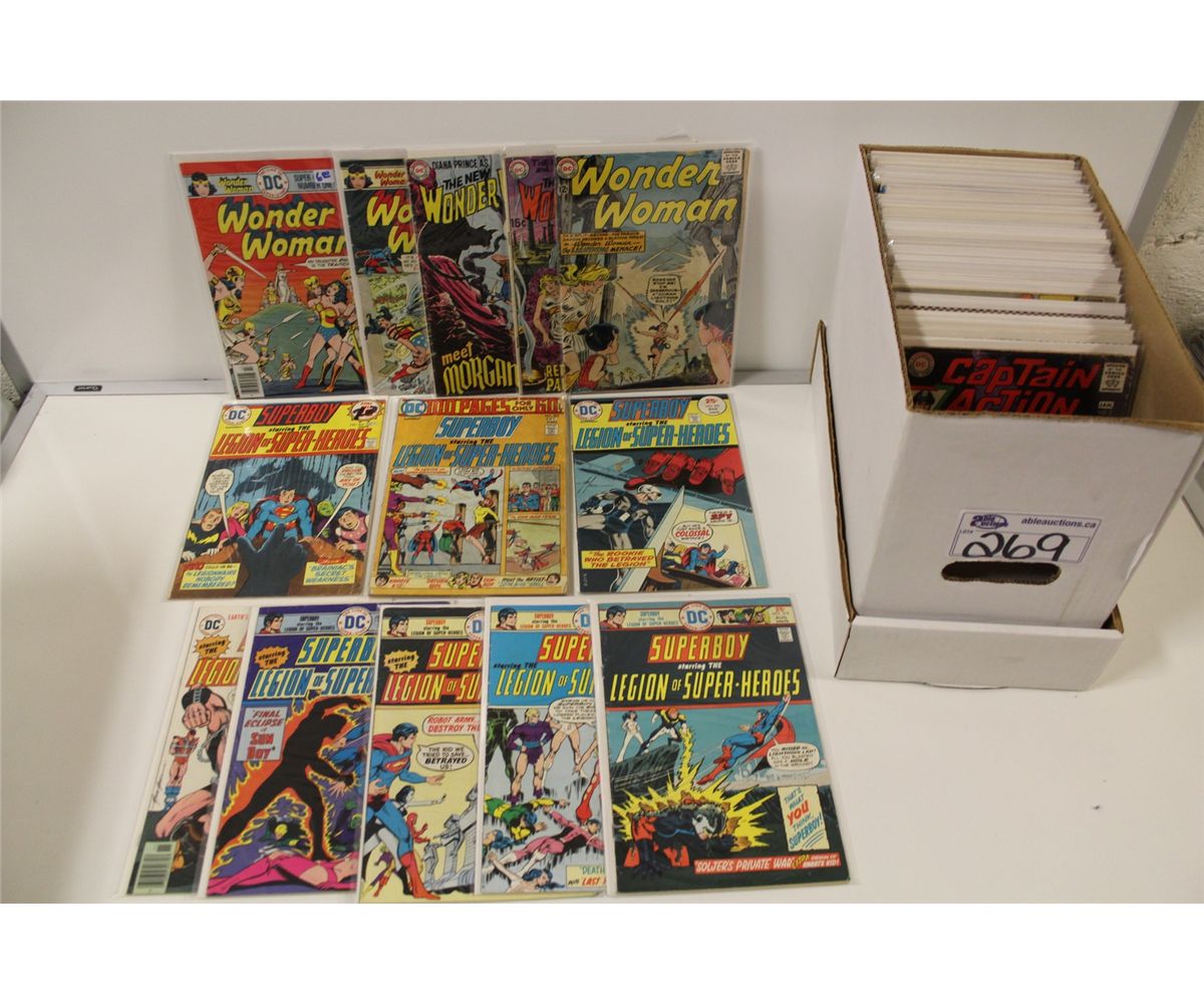 SHORT BOX OF ASSORTED SILVER TO BRONZE AGE SUPERHERO COMICS. INCLUDES CAPTAIN ACTION, ADVENTURE COMICS, SUPERBOY AND WONDER WOMAN!