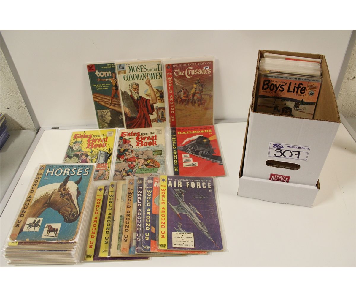SHORT BOX OF CLASSICS ILLUSTRATED, DELL  AND THE WORLD AROUND US COMICS. MANY 10 CENT COVERS