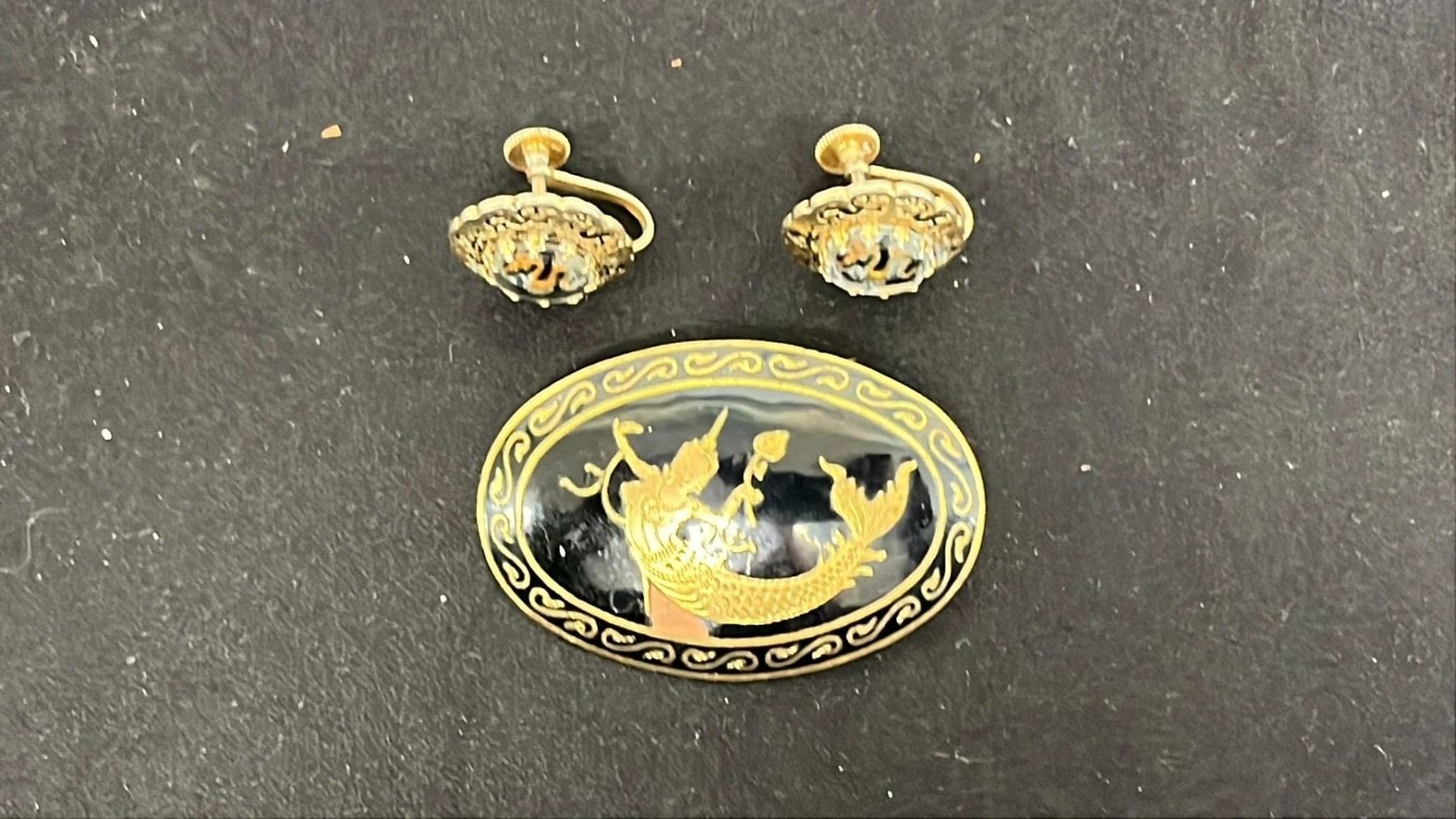 SIAM BRONZE MERMAID BROOCH WITH DRAGON REVERSE CARVED ANTIQUE SCREWBACK EARRING SET