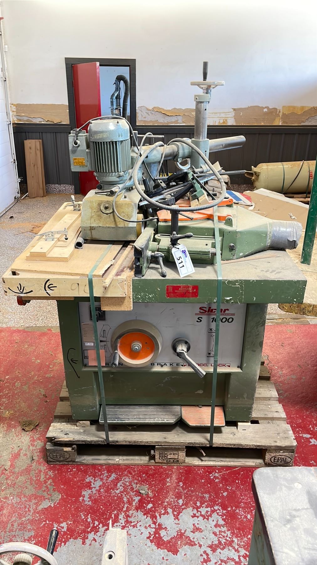 SICAR S1000 TILTING SPINDLE SHAPER WITH UNIVER 508 POWER FEEDER GREEN CAST BODY INCLUDES VERTICAL SPINDLE, ADJUSTABLE FENCE, TILTING TABLE, AND MOUNTED 4-WHEEL POWER FEEDER *ITEM IS LOCATED OFFSITE*