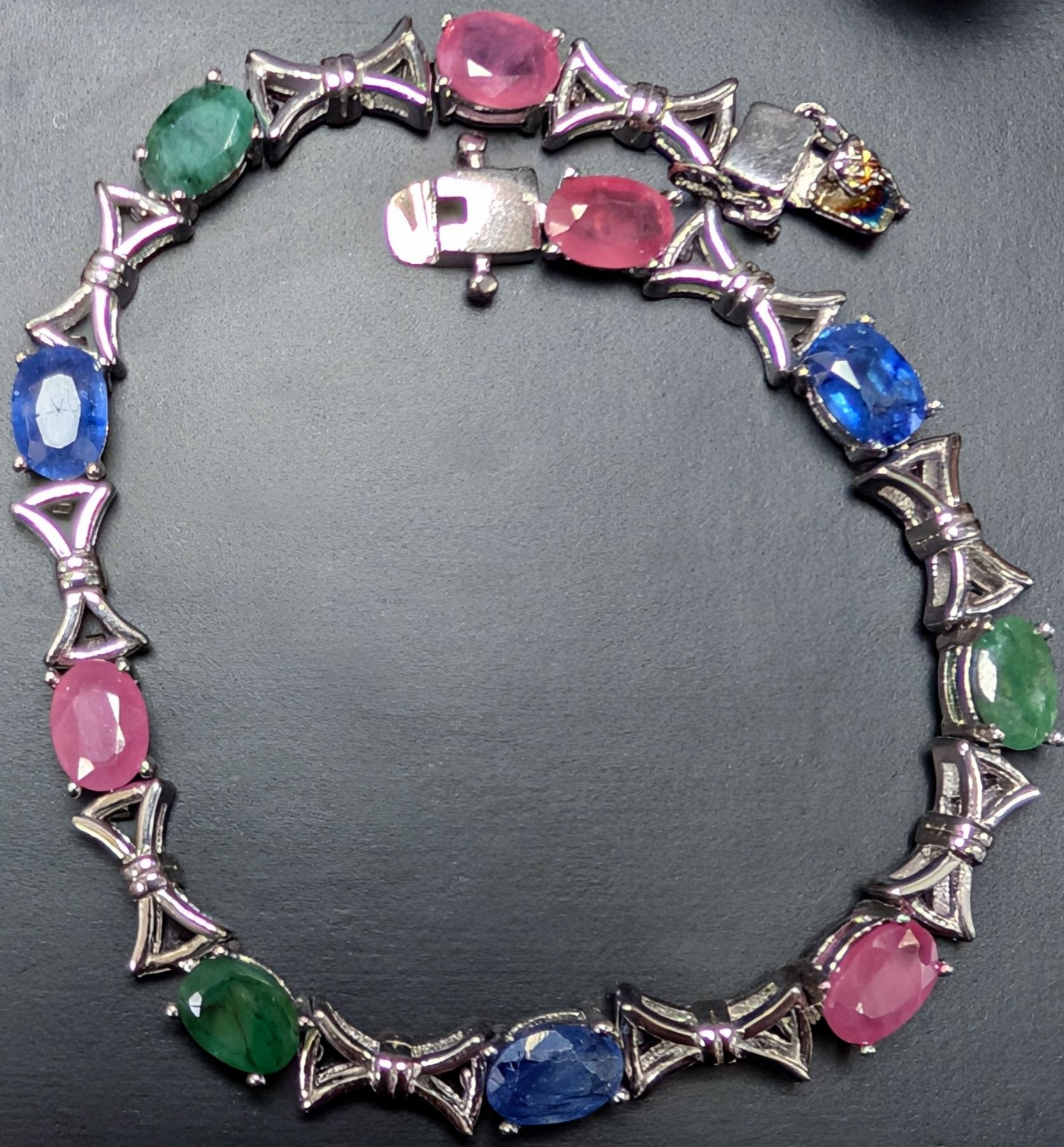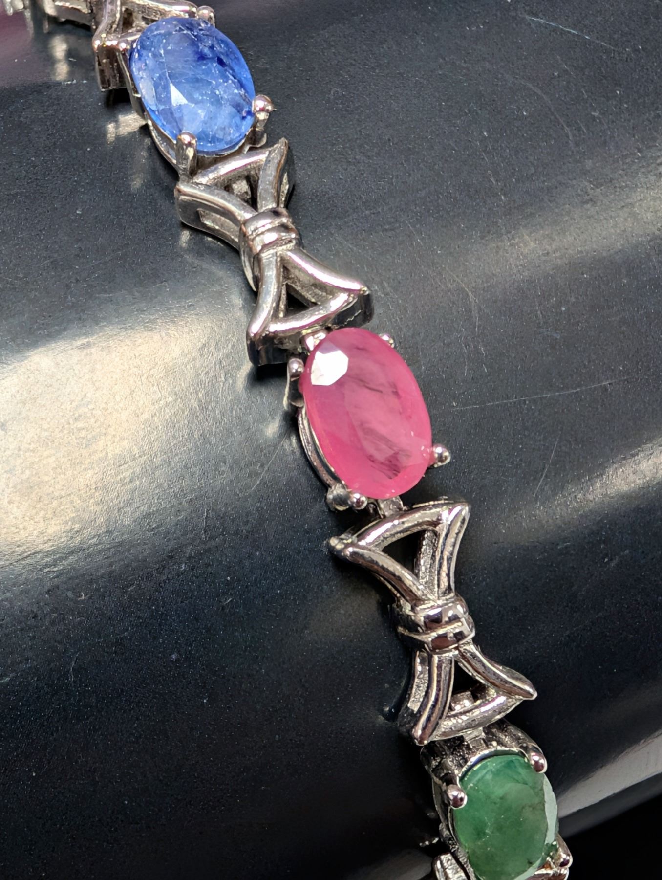 SILVER(13.3G), RUBY SAPPHIRE EMERALD (10CT) BRACELET 7.5", SUGGESTED RETAIL VALUE $700