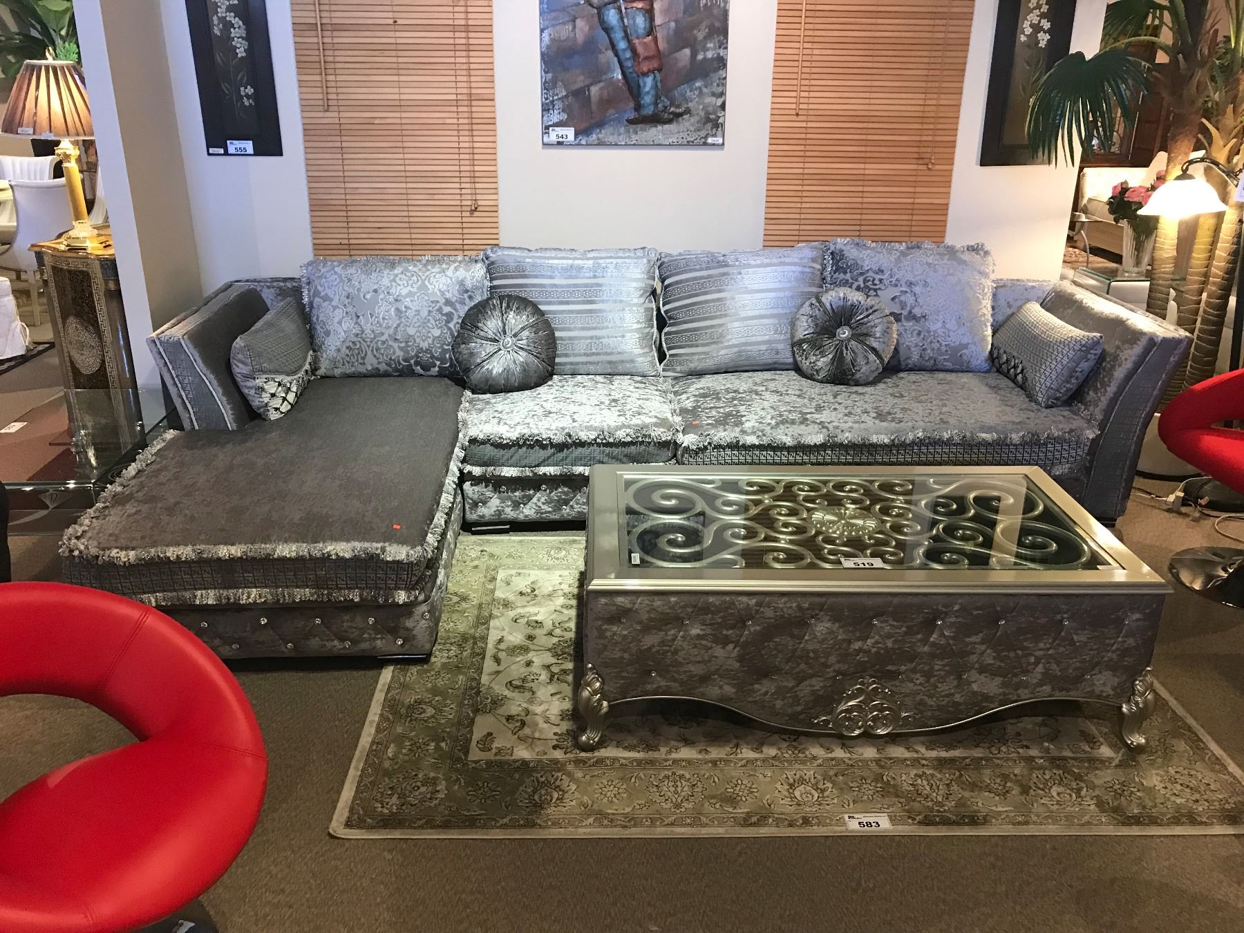 SILVER BLUE JEWEL STUDDED FABRIC 4 SEAT SOFA WITH CHAISE & FABRIC JEWEL STUDDED GLASS TOP COFFEE TABLE
