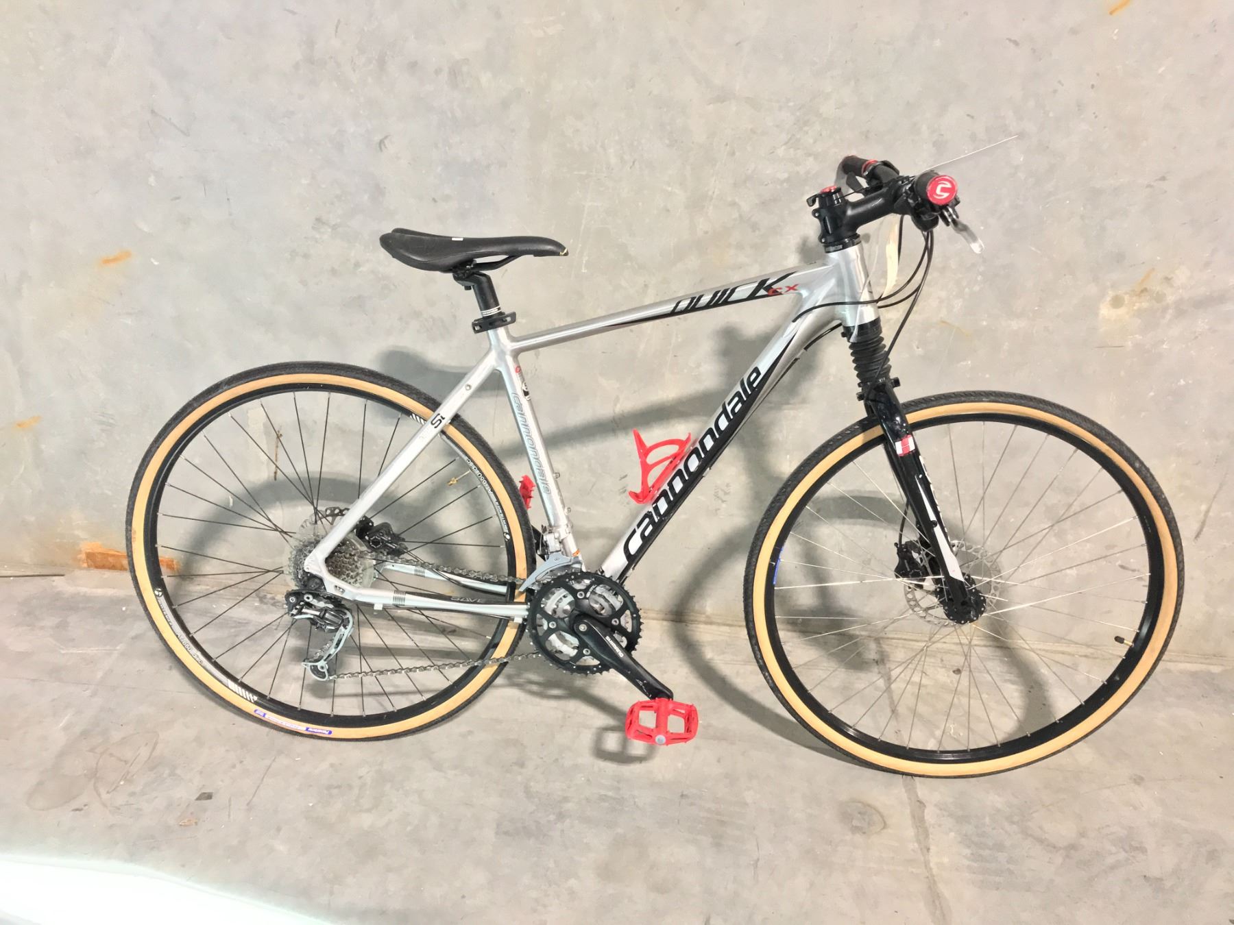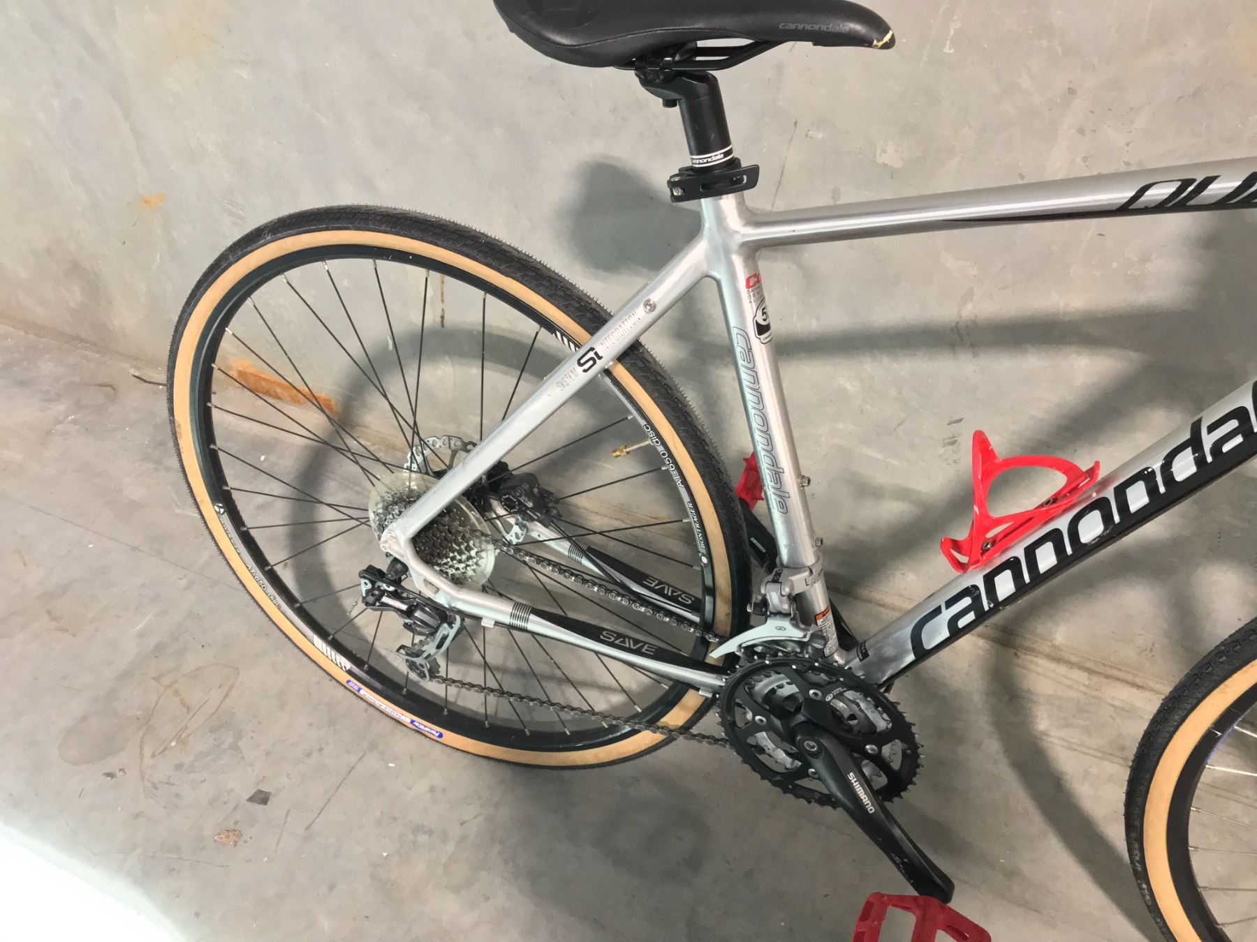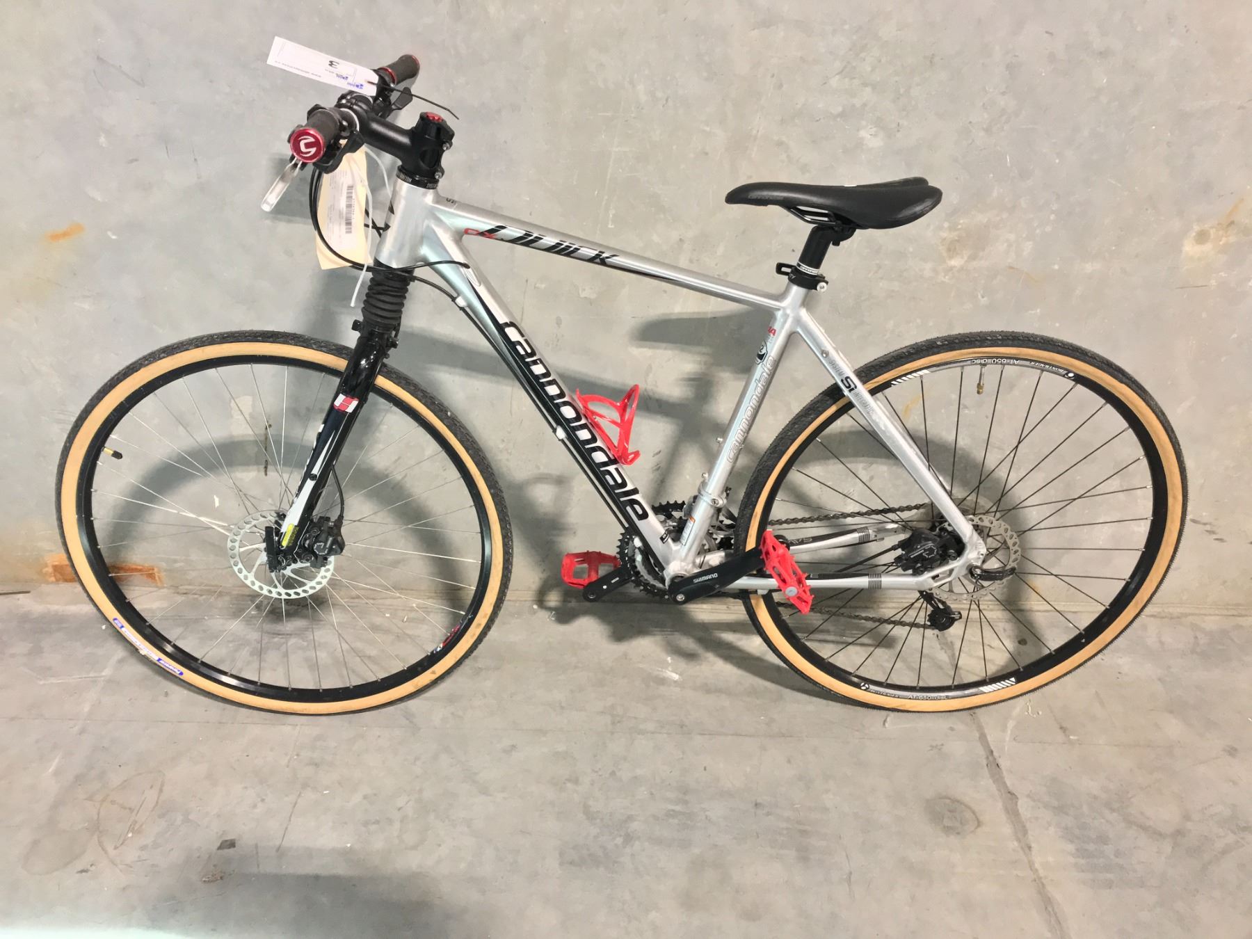 SILVER CANNONDALE 24 SPEED 20" FRAME, DISC BRAKES, FRONT SUSPENSION ROAD BIKE