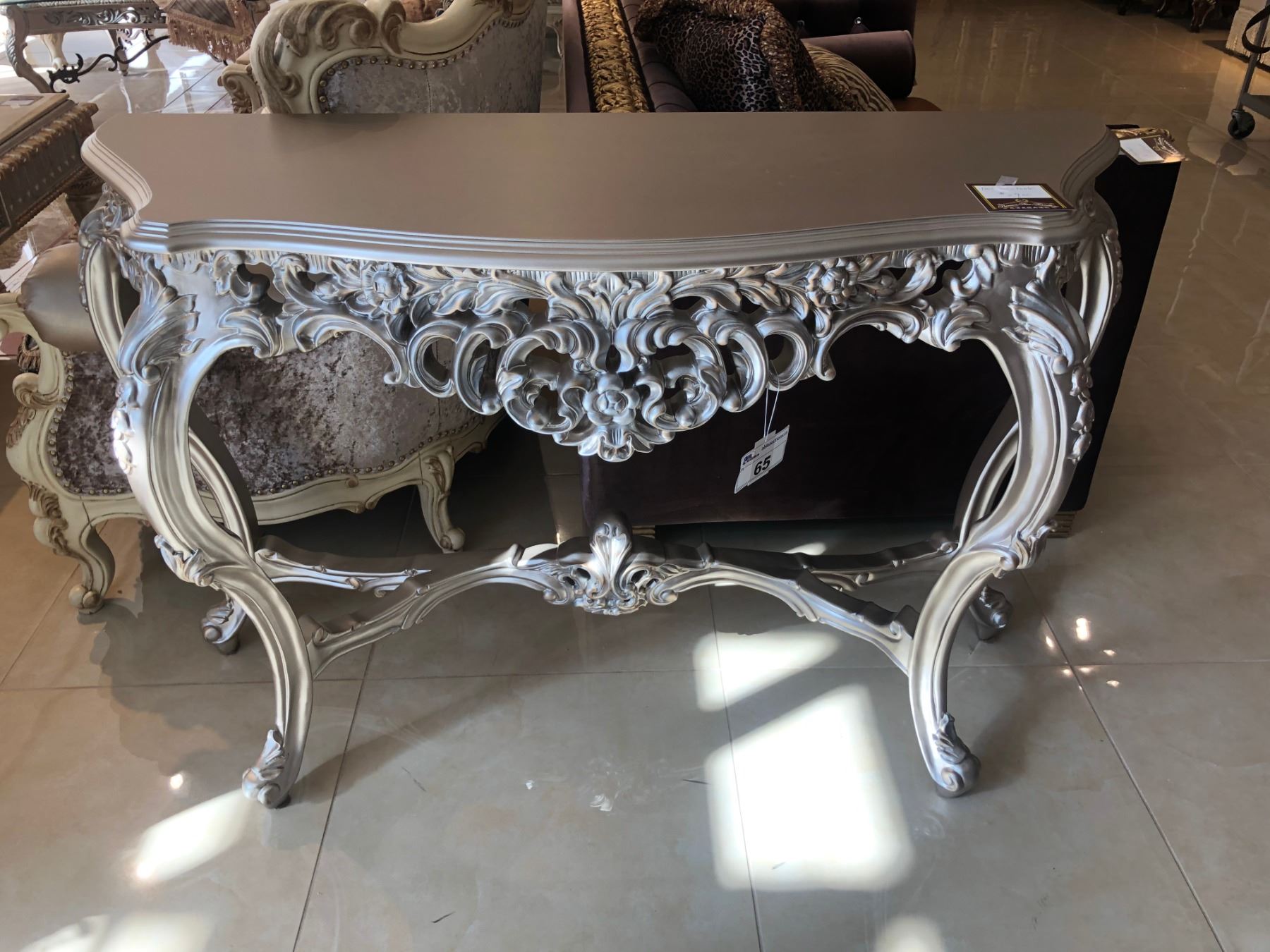 SILVER CARVED WOODEN HALL TABLE. RETAIL $2,900.00