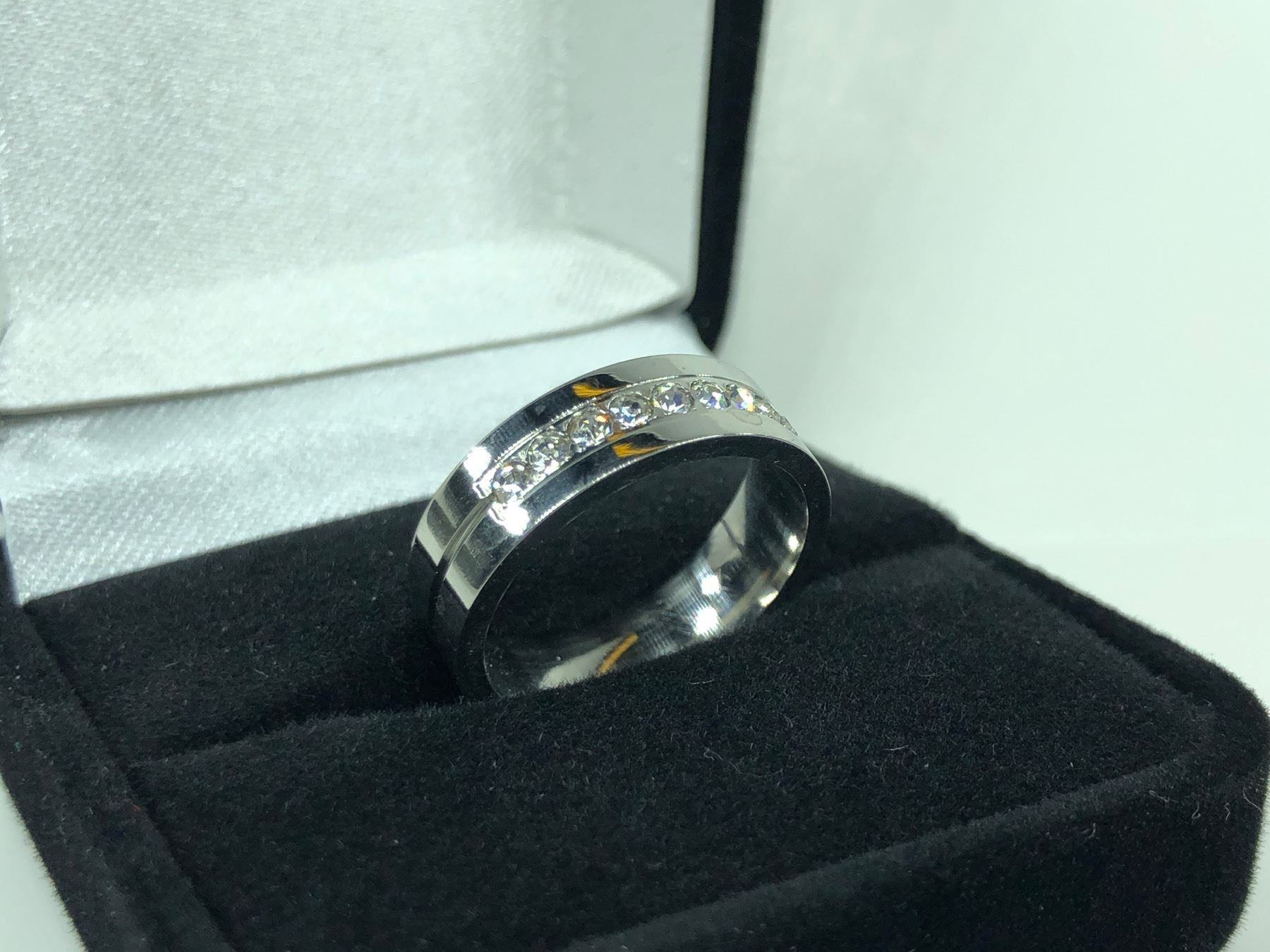 SILVER COLOUR TITANIUM STEEL RING WITH 9 CUBIC ZIRCONIUMS, SIZE 12, JEWELRY BOX NOT INCLUDED