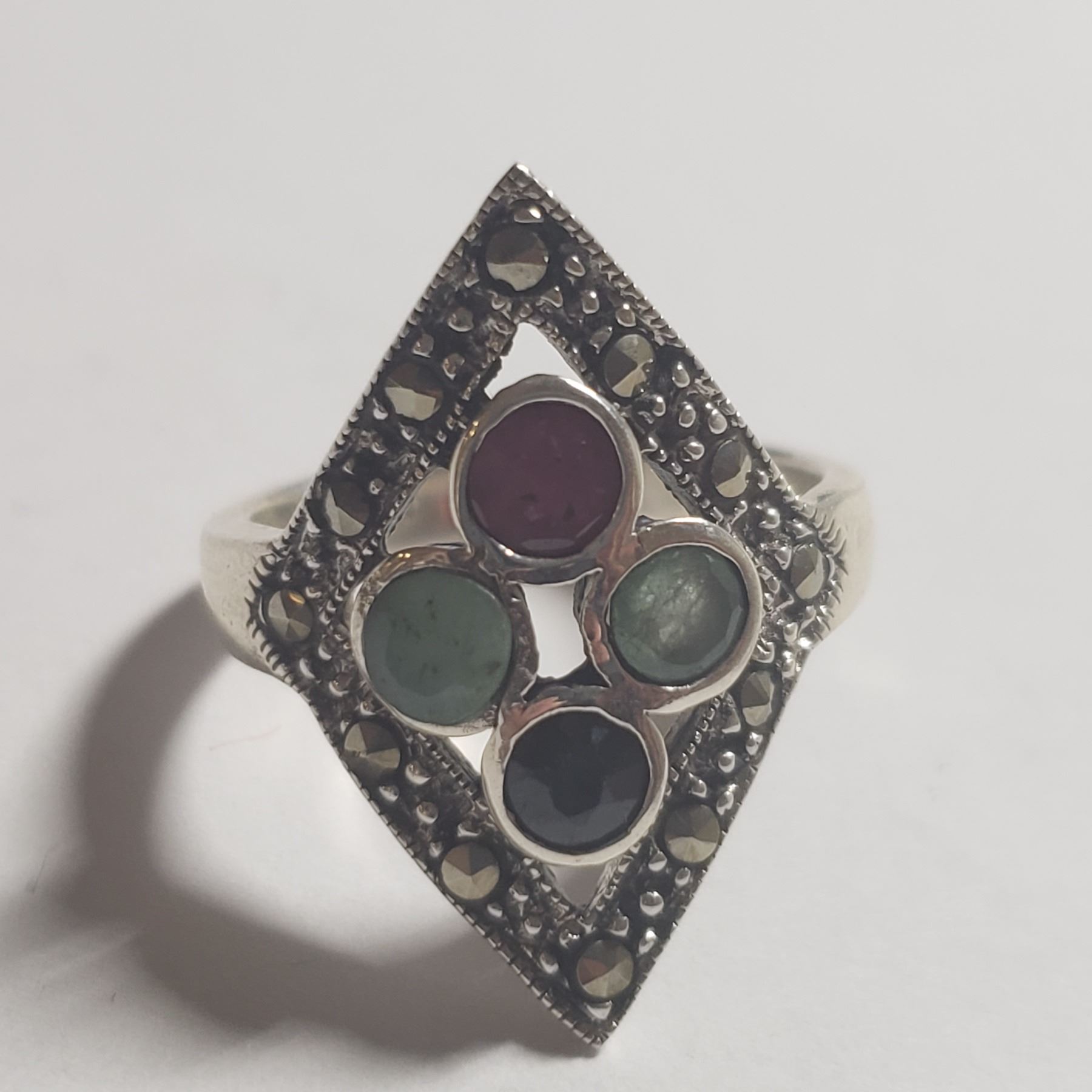 SILVER EMERALD RUBY SAPPHIRE RING (SIZE 7.75)