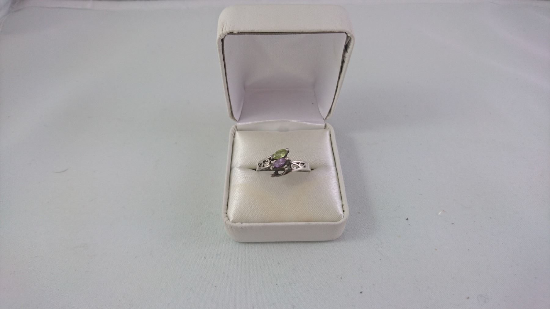 SILVER LADIES RING SET WIH MARQUISE GREEN STONE AND MARQUISE MAUVE STONE ( 1 STONE MISSING)