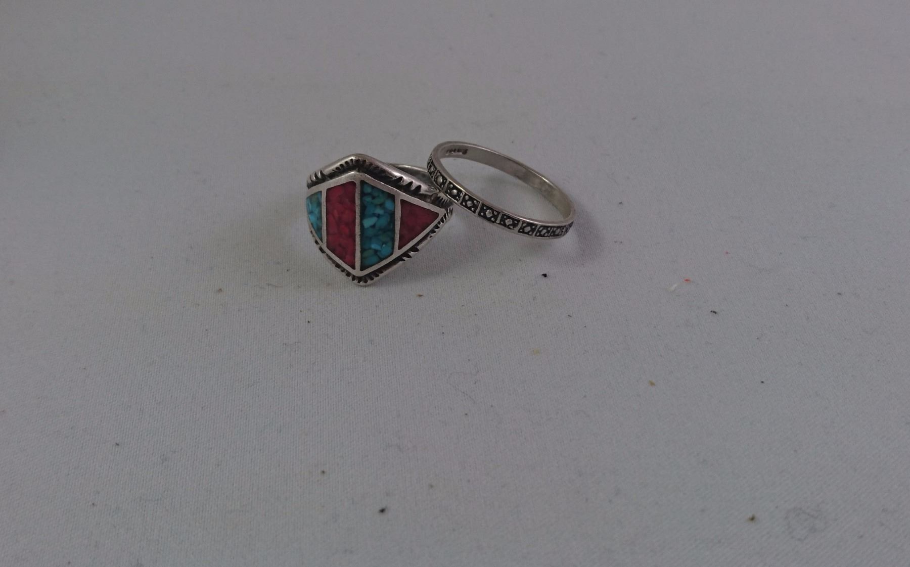 SILVER LADIES RING W/ INLAID BLUE AND ORANGE STONE + SILVER LADIES BAND
