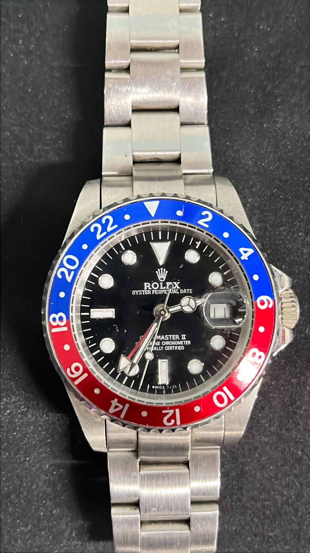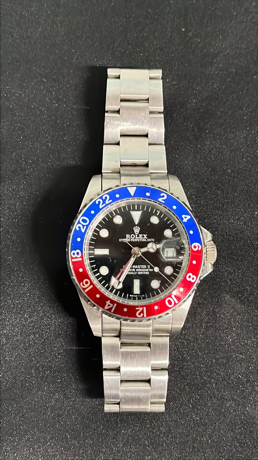 SILVER ONE-TONE ROLEX OYSTER PERPETUAL GMT MASTER II WATCH: BLUE & RED BEZEL - *REPLICA* REFERENCE #62523
