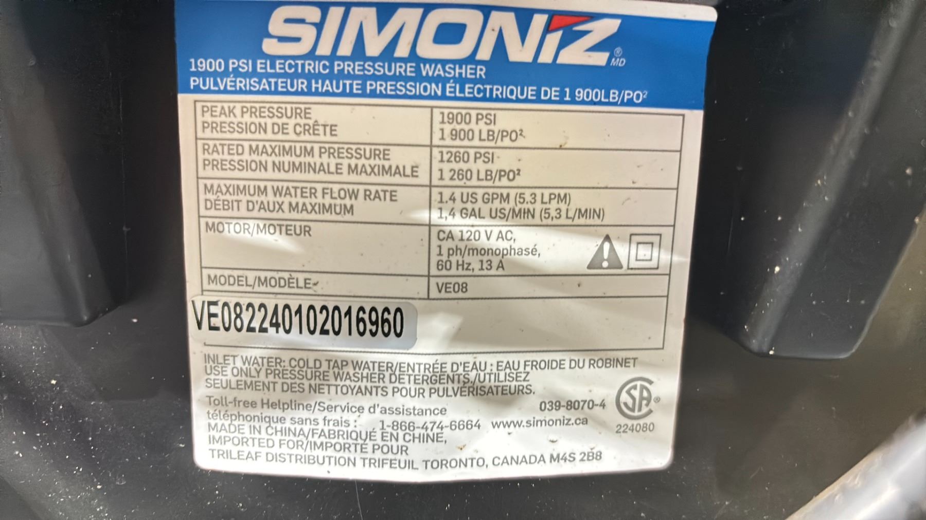 SIMONIZ 1900 PSI ELECTRIC PRESSURE WASHER WITH HOSE/WAND & A HARPER CONVERTIBLE HAND TRUCK