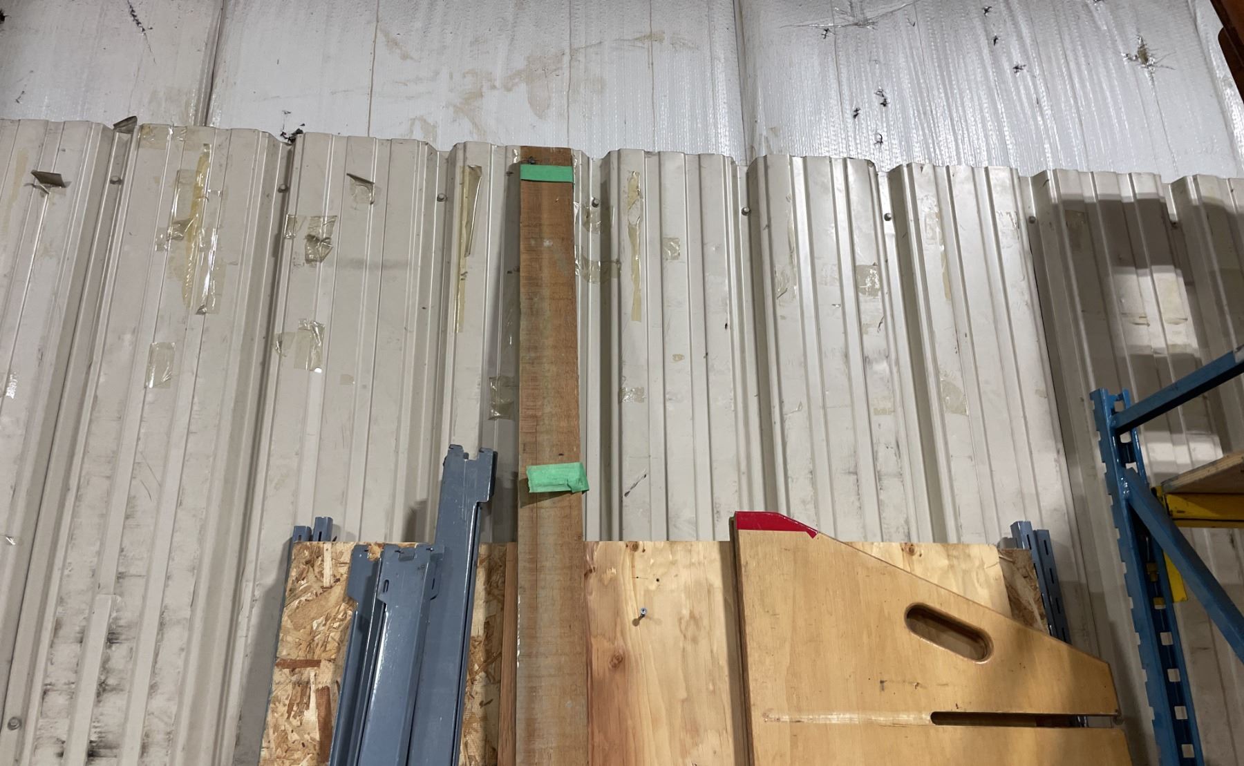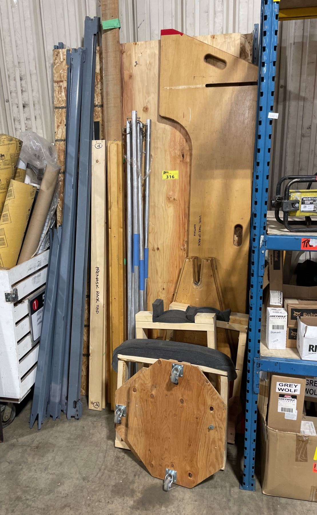 SINGLE BAY OF EZ RECT SHELVING UNIT, MOBILE WOODEN ROLL RACK, WOODEN PRINTER STAND, & STRAIGHT EDGE