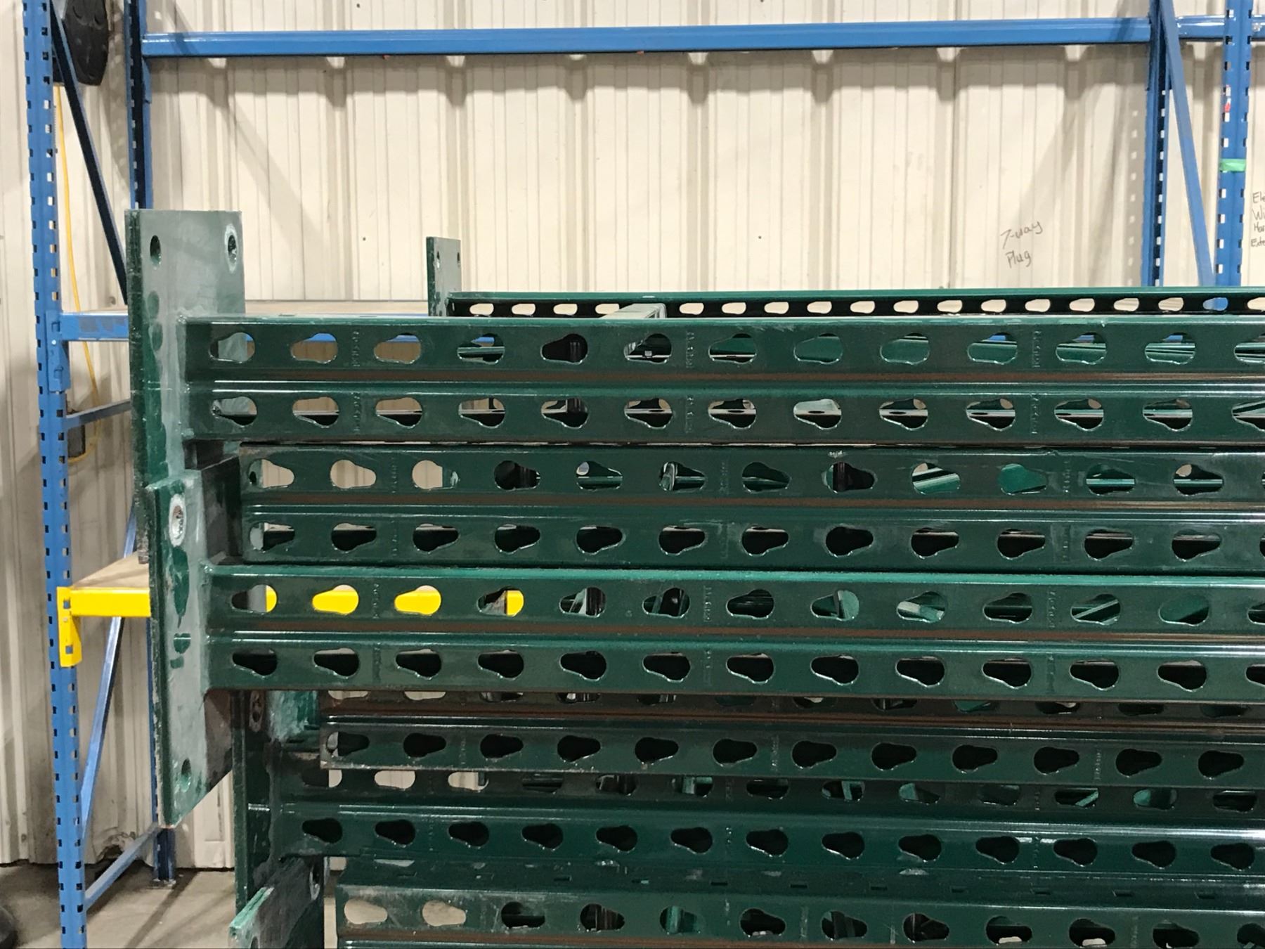 SINGLE FREESTANDING BAY OF 20' GREEN RACKSTEEL INDUSTRIAL PALLET RACKING WITH 6 ORANGE 8' SHELVES: 2 - 20'H X 42"D GREEN RACKSTEEL PALLET RACKING UPRIGHTS, 12 - 8'W X 4"T RACKSTEEL ORANGE CROSSBARS ( LOCKING CLIPS MAY BE REQUIRED )