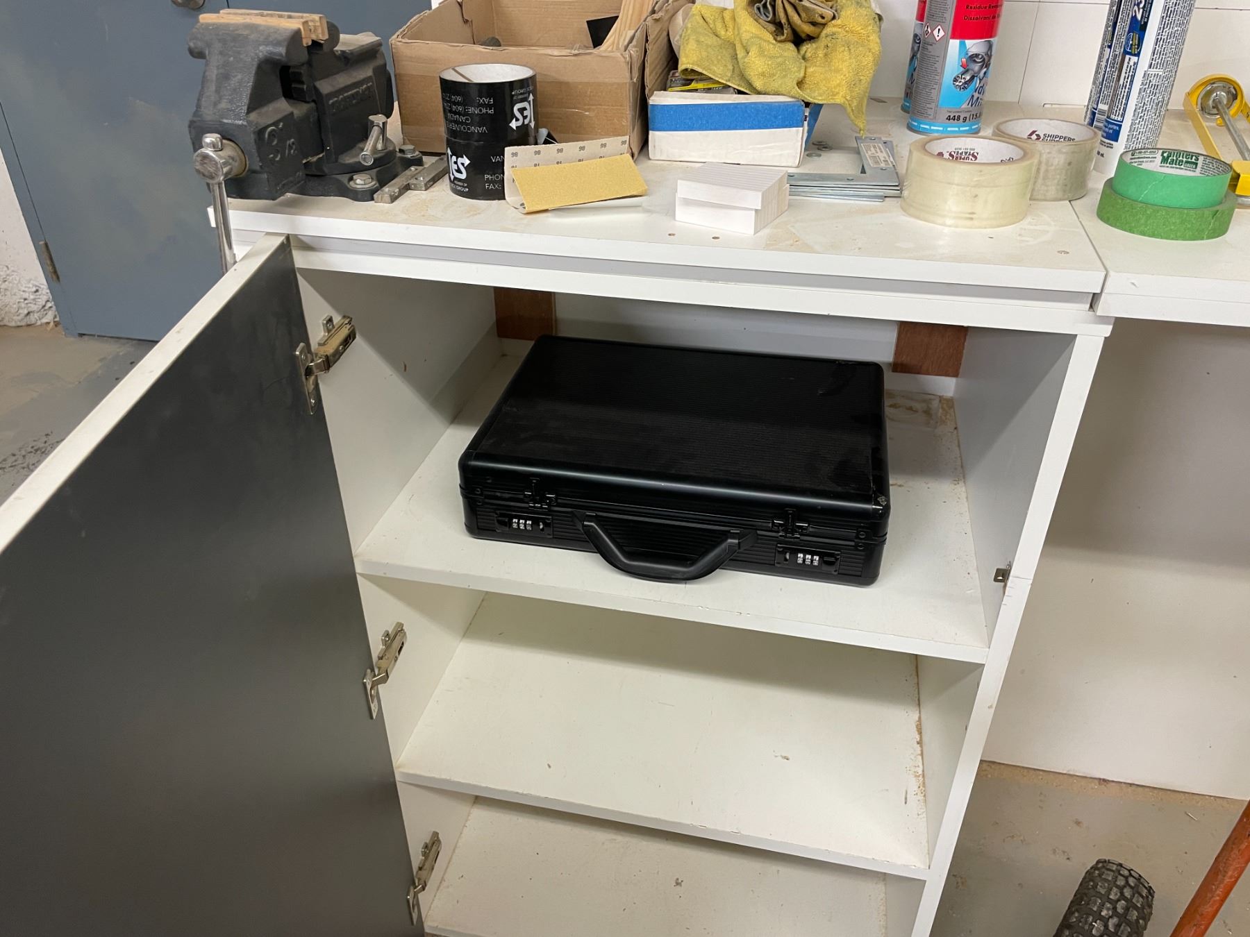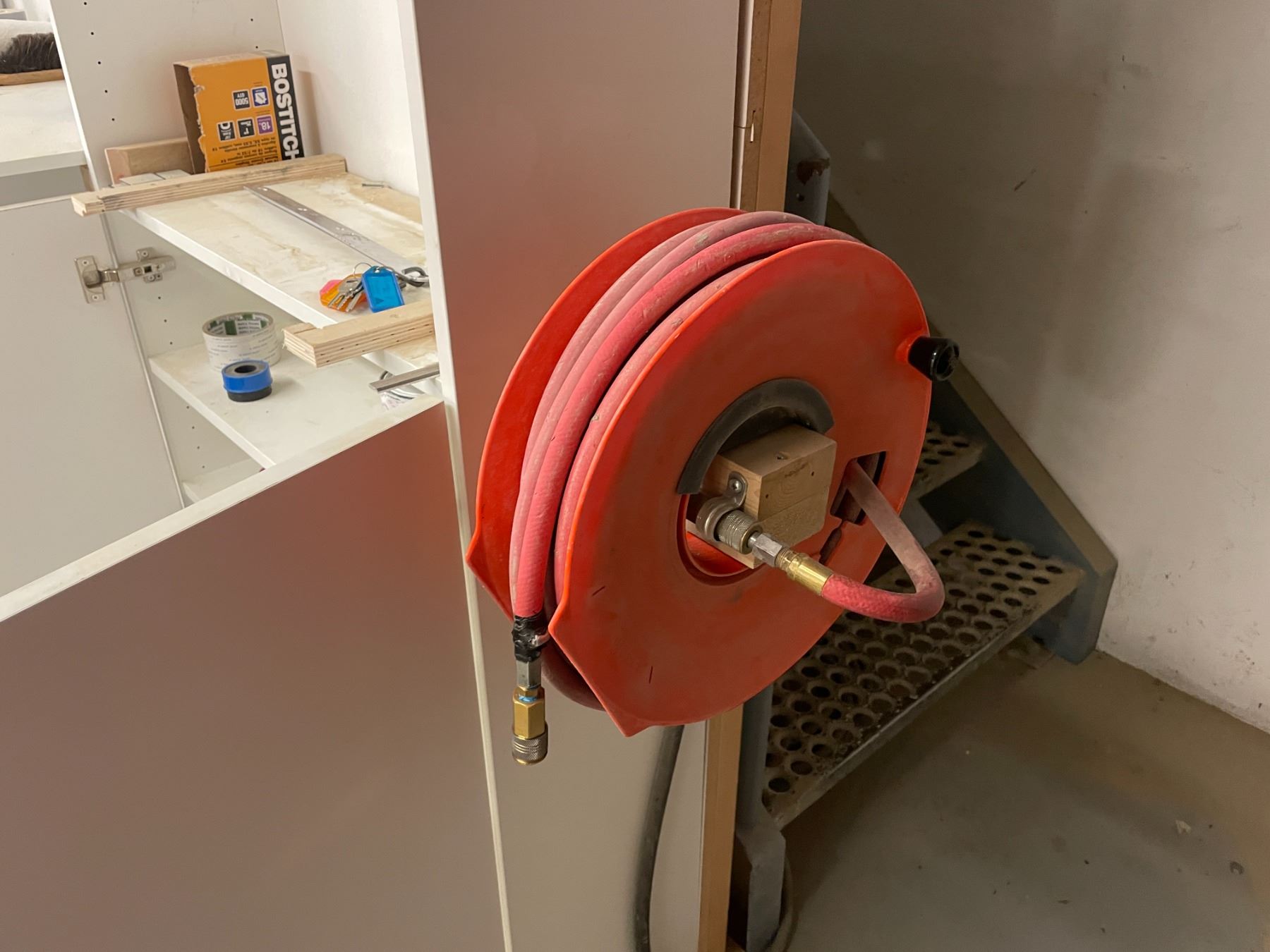 SKID 2 - 2 WHEEL HAND TRUCKS, FOLDING SAW DOLLY, BIT TRAY WITH BITS & ASSORTED PAINTS/TOOLS IN CABINETS (AIR HOSE REEL)