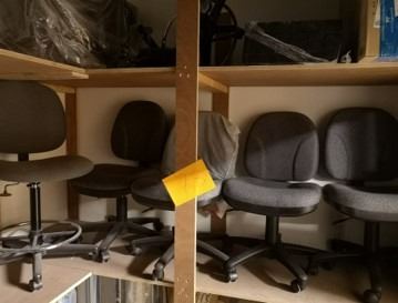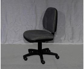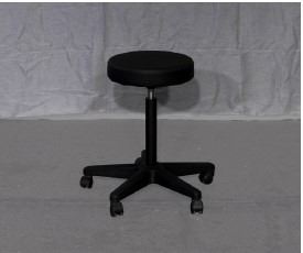 SKID 72 - BLACK TASK STOOL, ROUND SEAT, BLACK LEATHER, SKID 73 - GREY OFFICE CHAIR ON WHEELS, GREY FABRIC