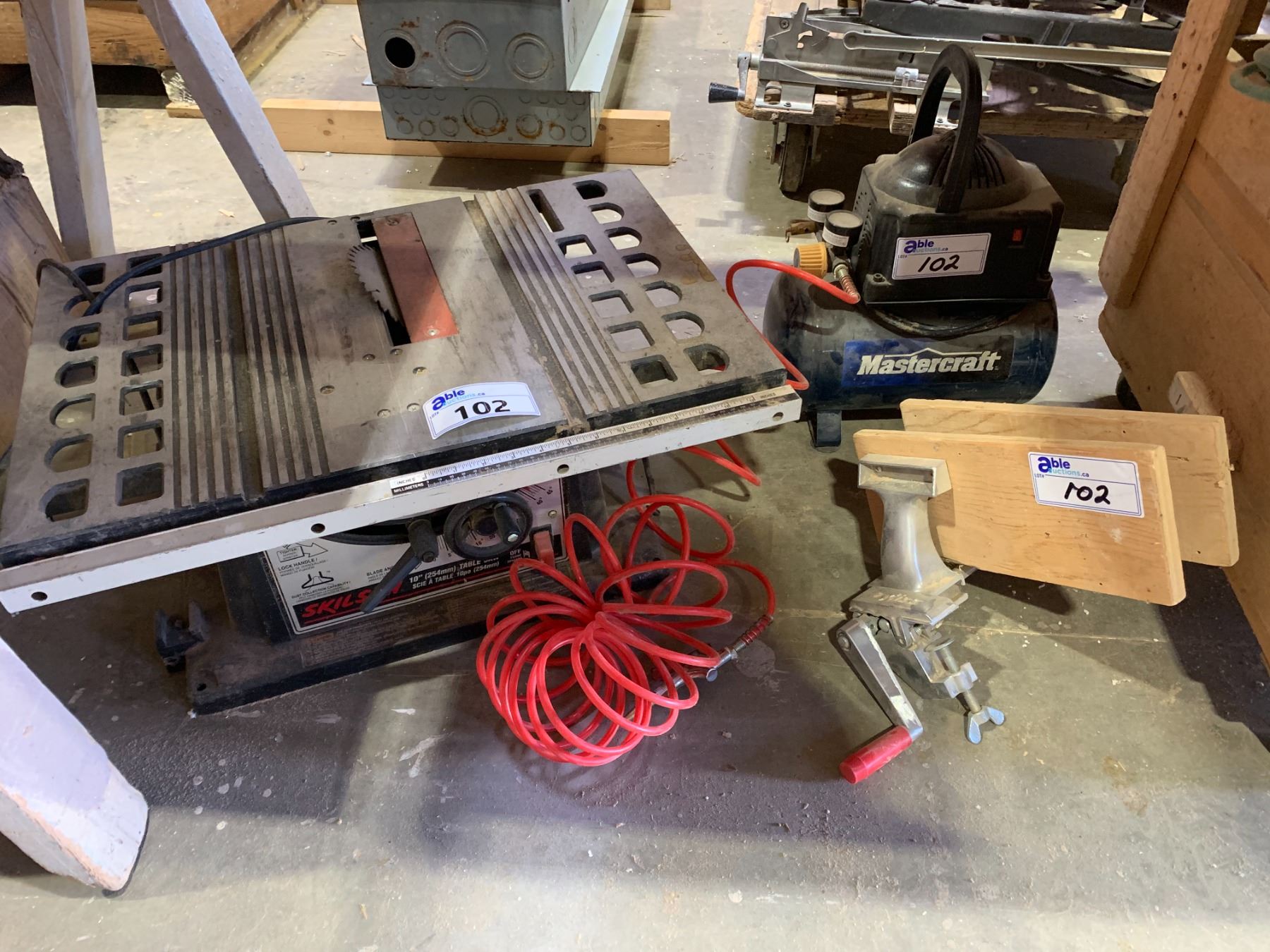SKILSAW 10" TABLE SAW, MASTERCRAFT AIR COMPRESSOR, & ZYLISS INDUSTRIAL CLAMP