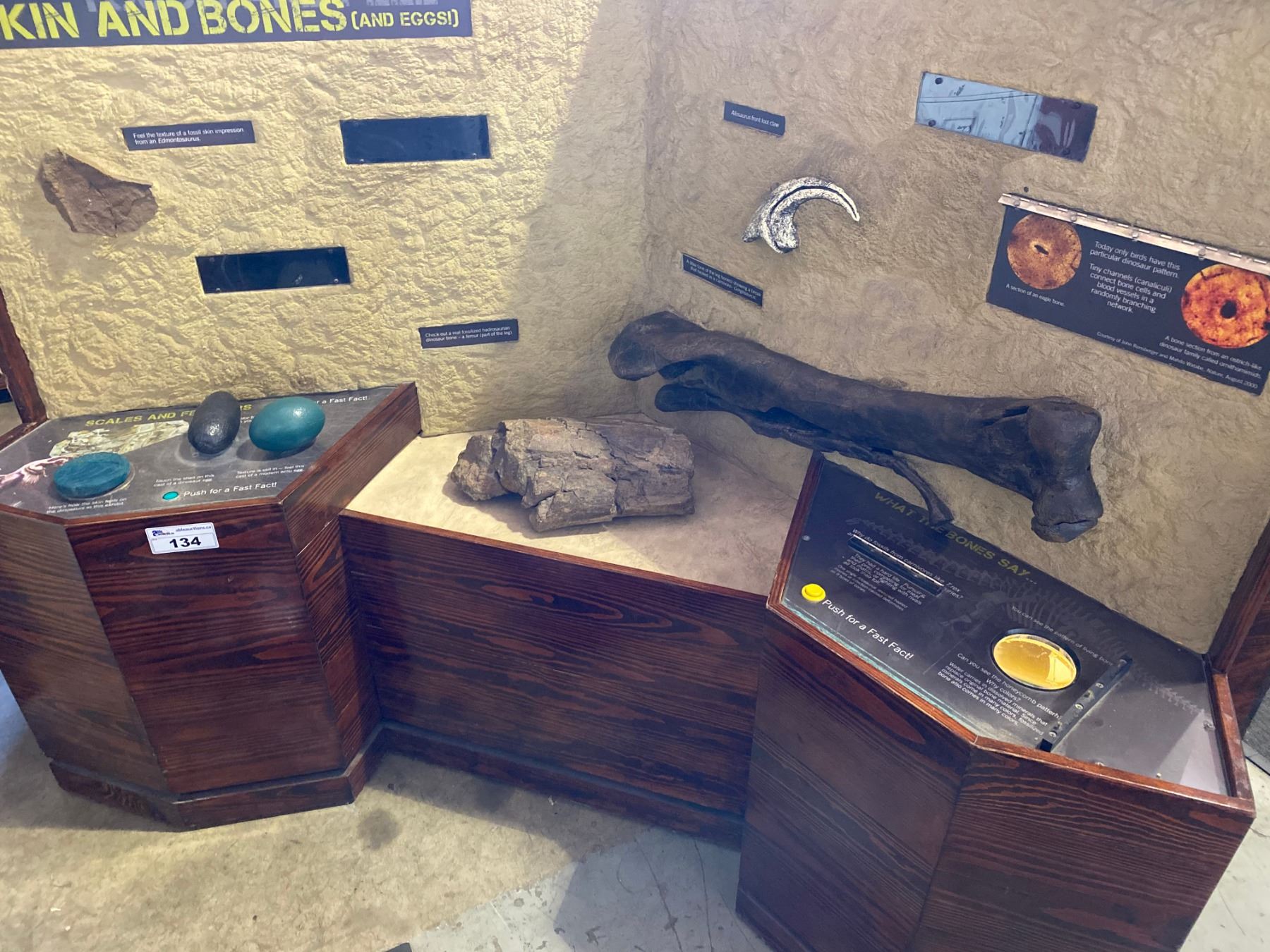 "SKIN AND BONES (AND EGGS)" INTERACTIVE STATION WITH DISPLAY BONES, ILLUMINATED FOSSIL & INFORMATION, MEASURES 78" LONG X 38" WIDE X 62" TALL APPROX 350LBS