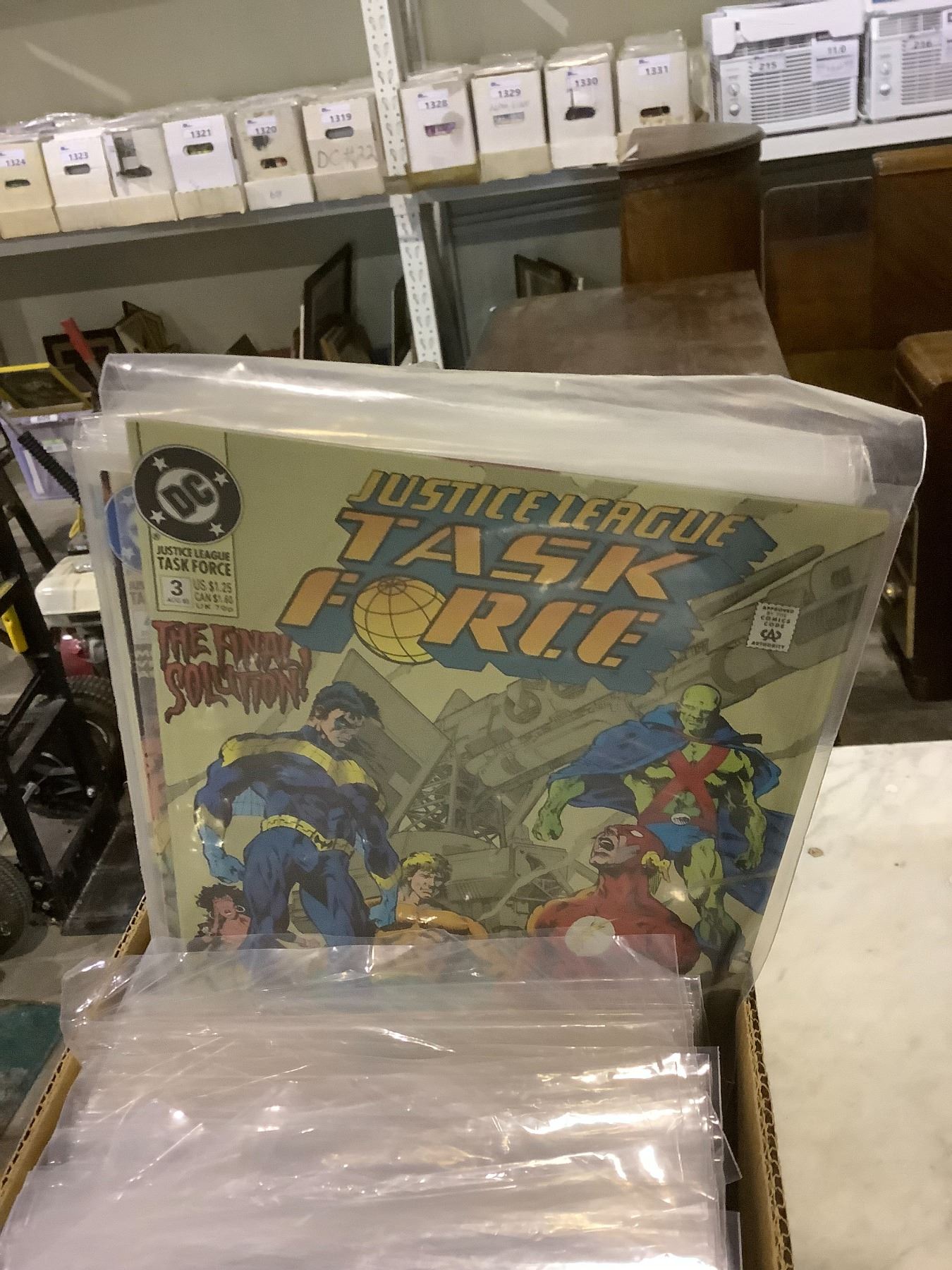 SLEEVE OF ASSORTED COMICS BOOKS TITLES INCLUDING; JUSTICE LEAGUE, JUDGE DREDD, KAMANDI AND MORE