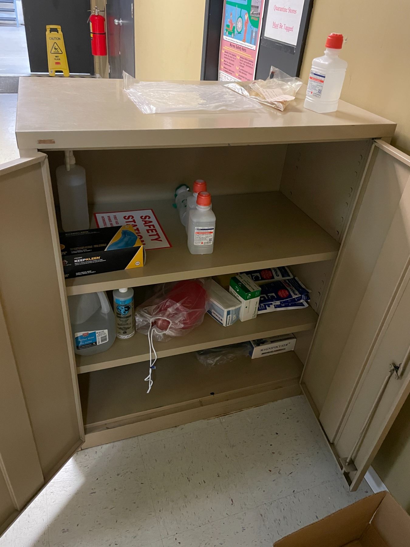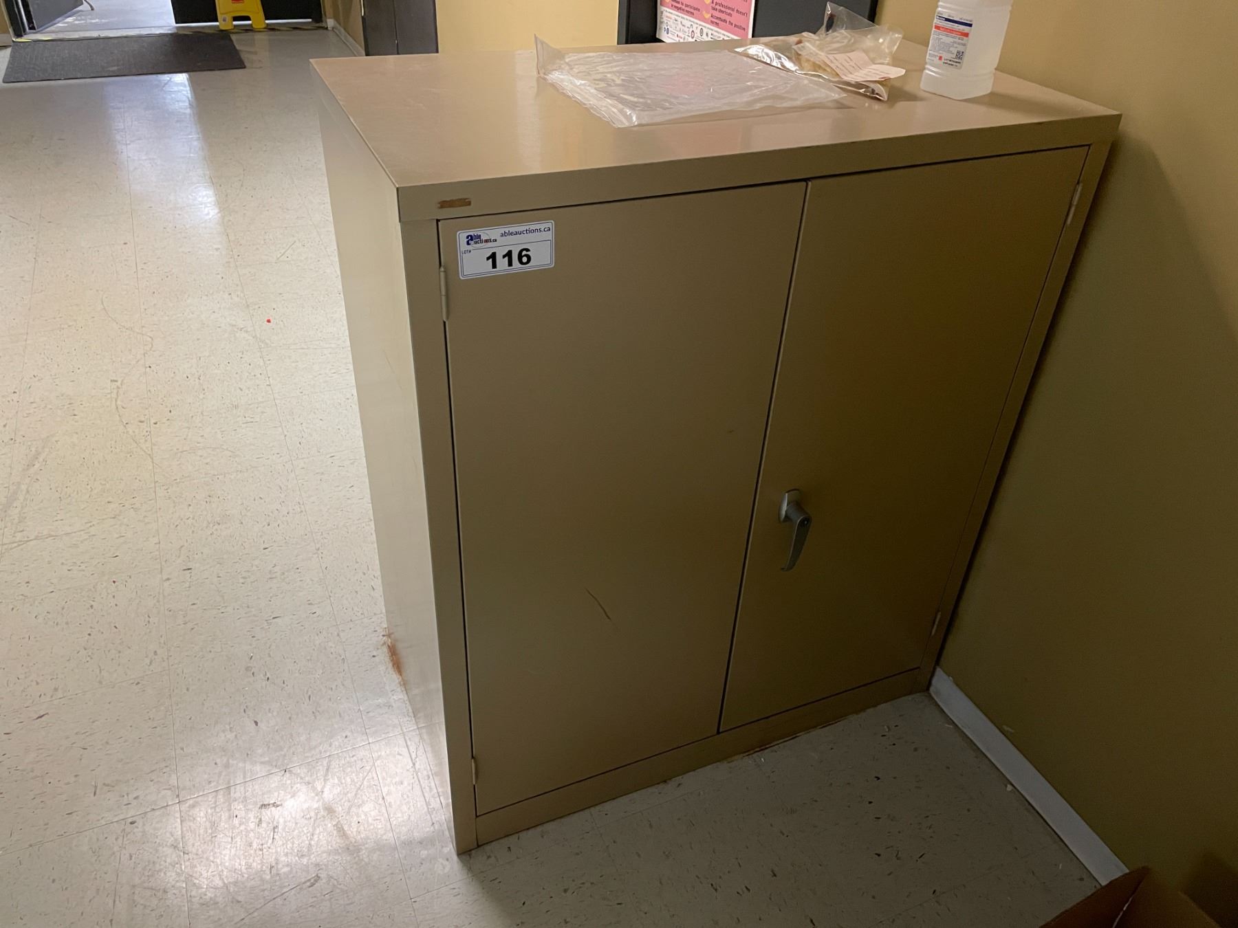 SMALL BEIGE METAL 2 DOOR CONSUMABLES CABINET & CONTENTS