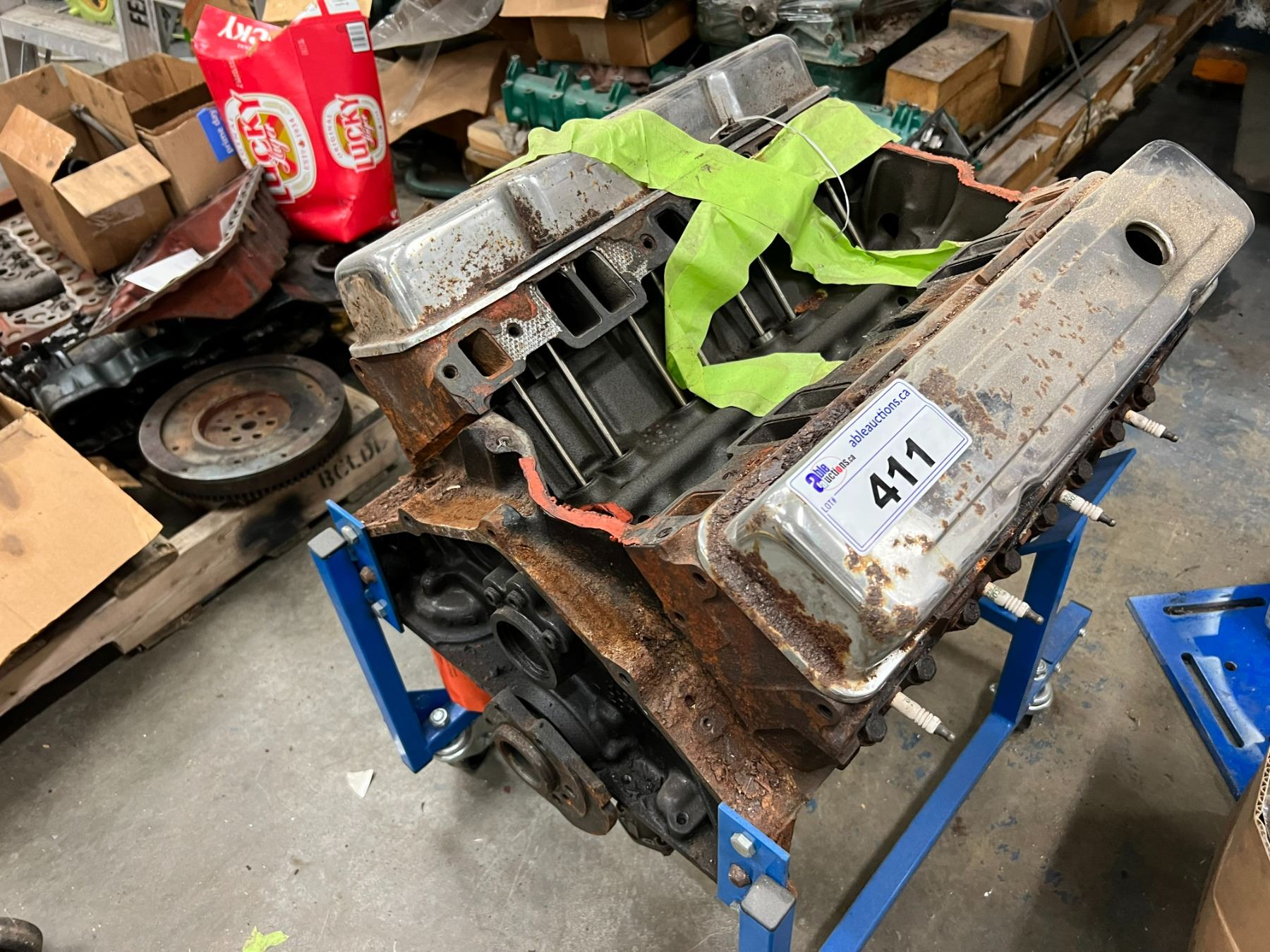 SMALL BLOCK CHEVY ENGINE. NEEDS REBUILDING. 305 CI ON ROLLING STAND. BLOCK NUMBER 14010201. NO INTAKE OR OIL PAN