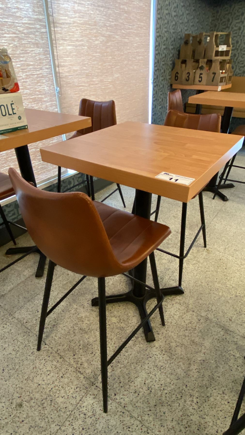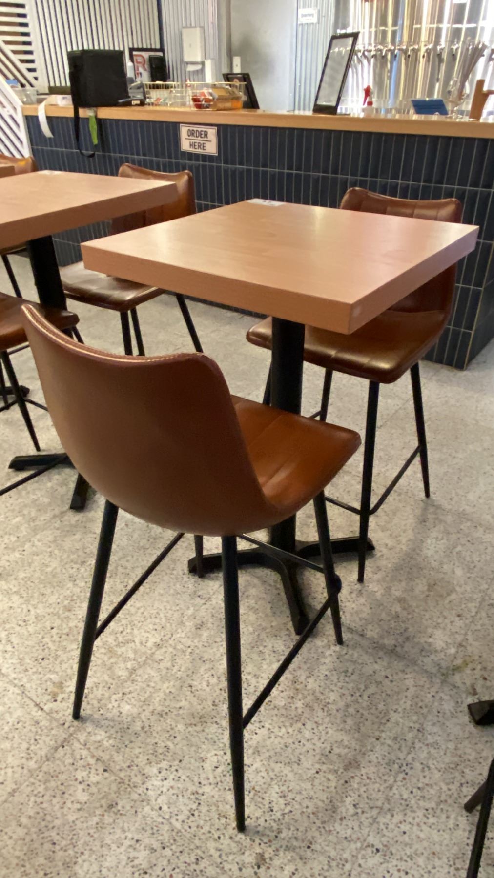 SMALL COUNTER HEIGHT BAR/BISTRO TABLE WITH 2 BROWN LEATHER UPHOLSTERED CHAIRS - APPROX. 2FT X 2FT X 3FT HIGH