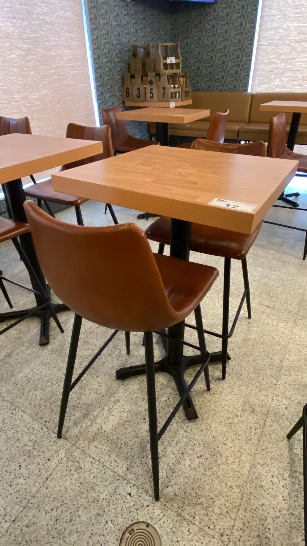 SMALL COUNTER HEIGHT BAR/BISTRO TABLE WITH 2 BROWN LEATHER UPHOLSTERED CHAIRS - APPROX. 2FT X 2FT X 3FT HIGH