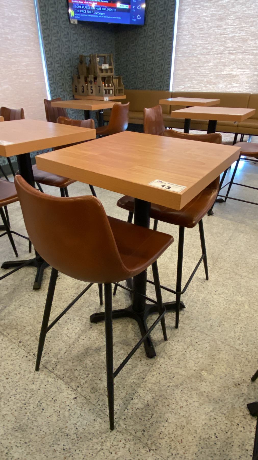 SMALL COUNTER HEIGHT BAR/BISTRO TABLE WITH 2 BROWN LEATHER UPHOLSTERED CHAIRS - APPROX. 2FT X 2FT X 3FT HIGH