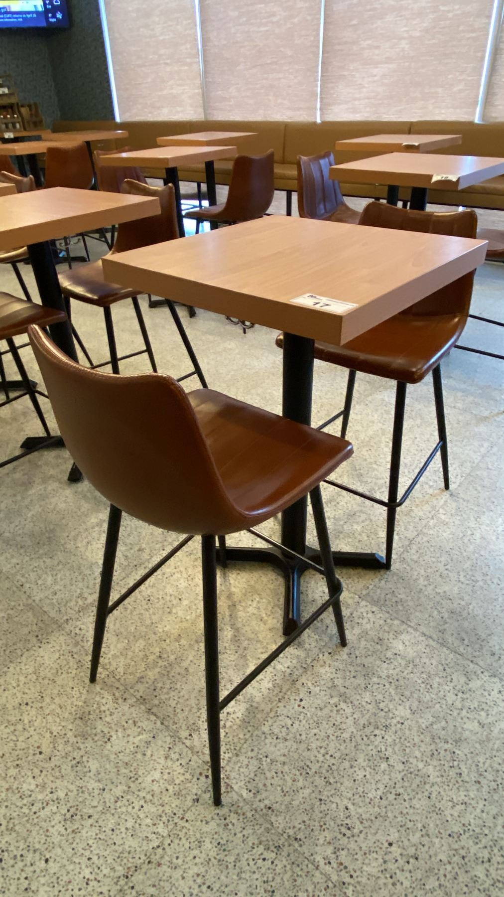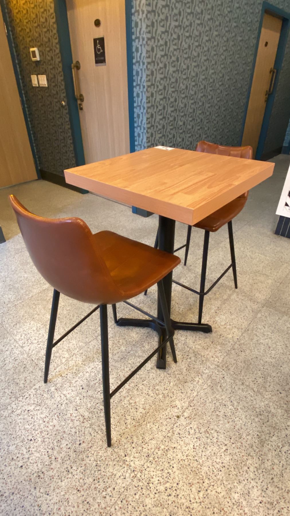 SMALL COUNTER HEIGHT BAR/BISTRO TABLE WITH 2 BROWN LEATHER UPHOLSTERED CHAIRS - APPROX. 2FT X 2FT X 3FT HIGH