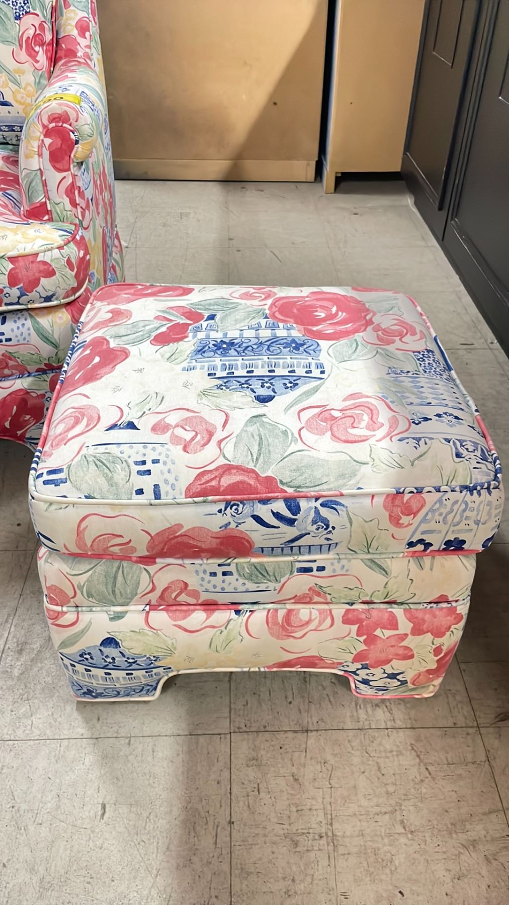 SMALL FLORAL MOTIF FABRIC LOUNGE CHAIR WITH OTTOMAN & THROW CUSHION