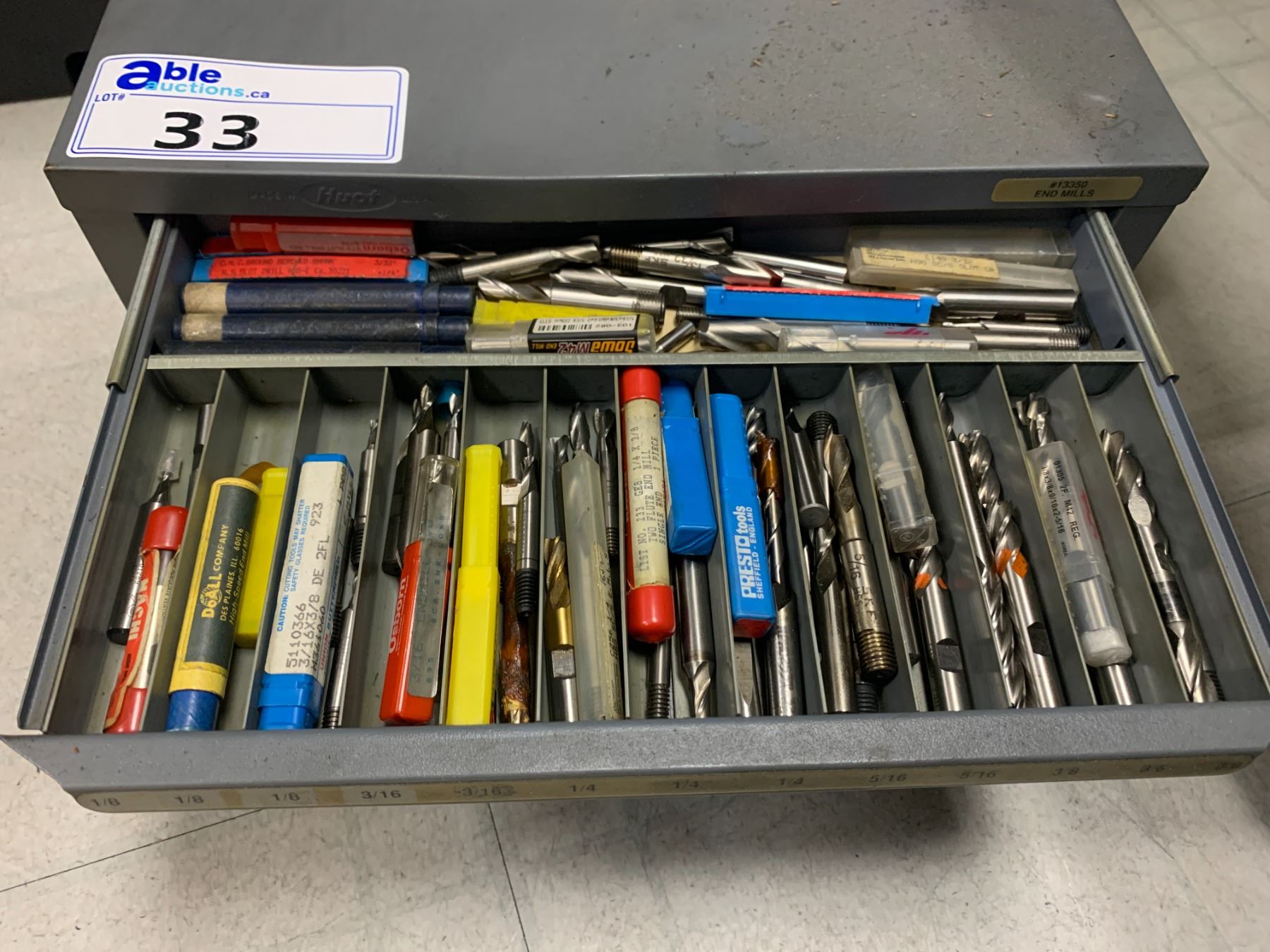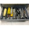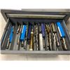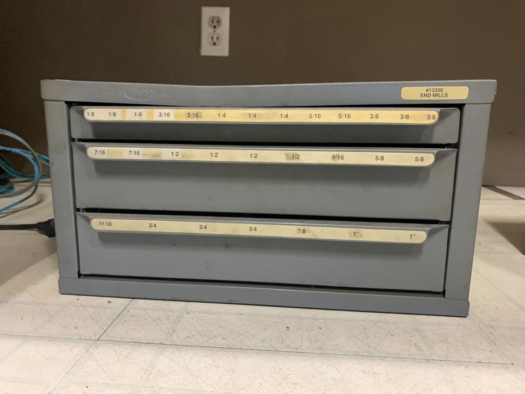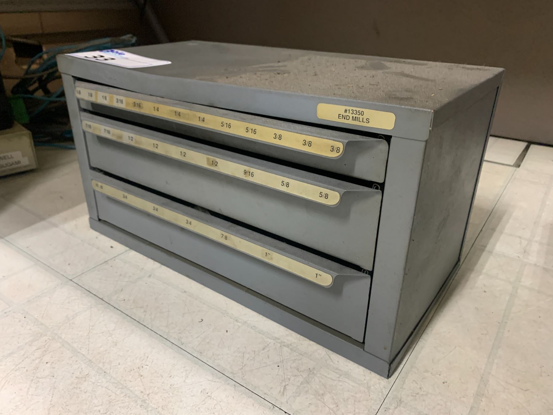 SMALL GREY METAL 3 DRAWER PARTS CABINET FILLED WITH ASSORTED END MILLS