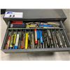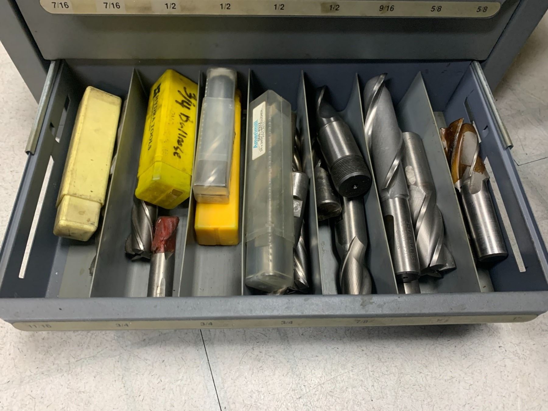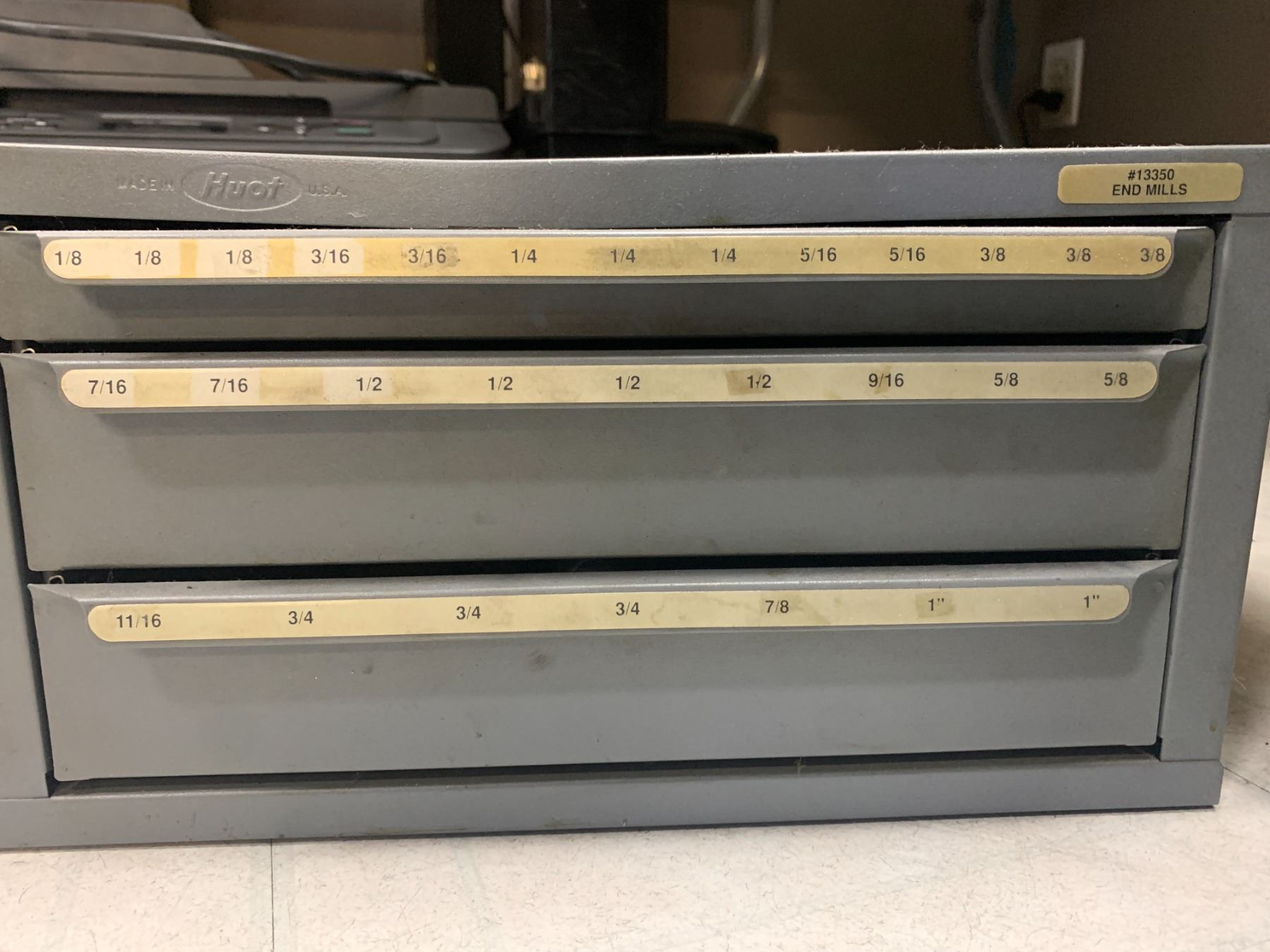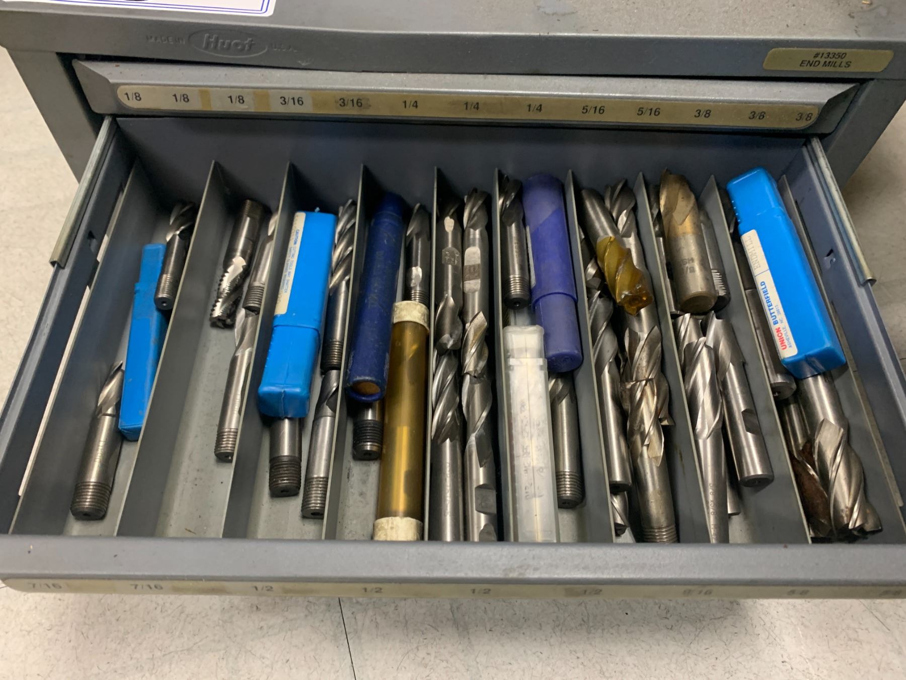 SMALL GREY METAL 3 DRAWER PARTS CABINET FILLED WITH ASSORTED END MILLS