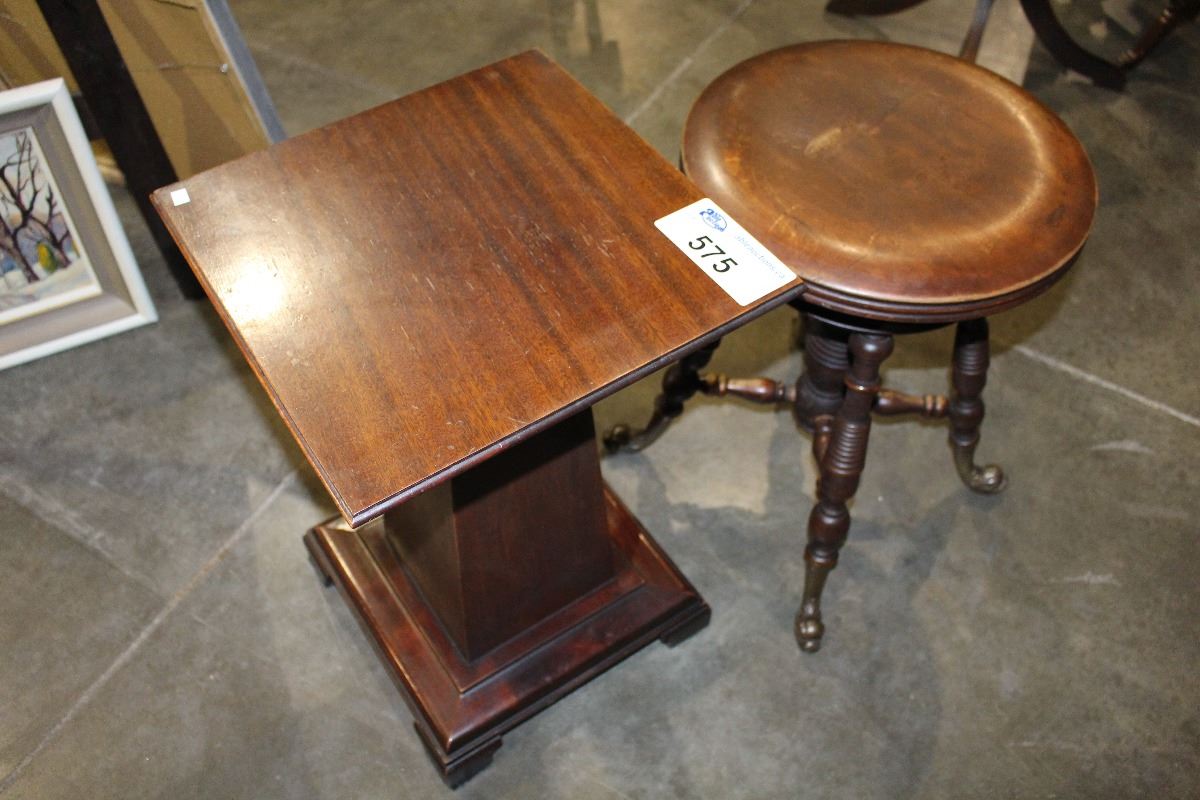 SMALL MAHOGANY PEDESTAL SIDE TABLE AND PIANO STOOL