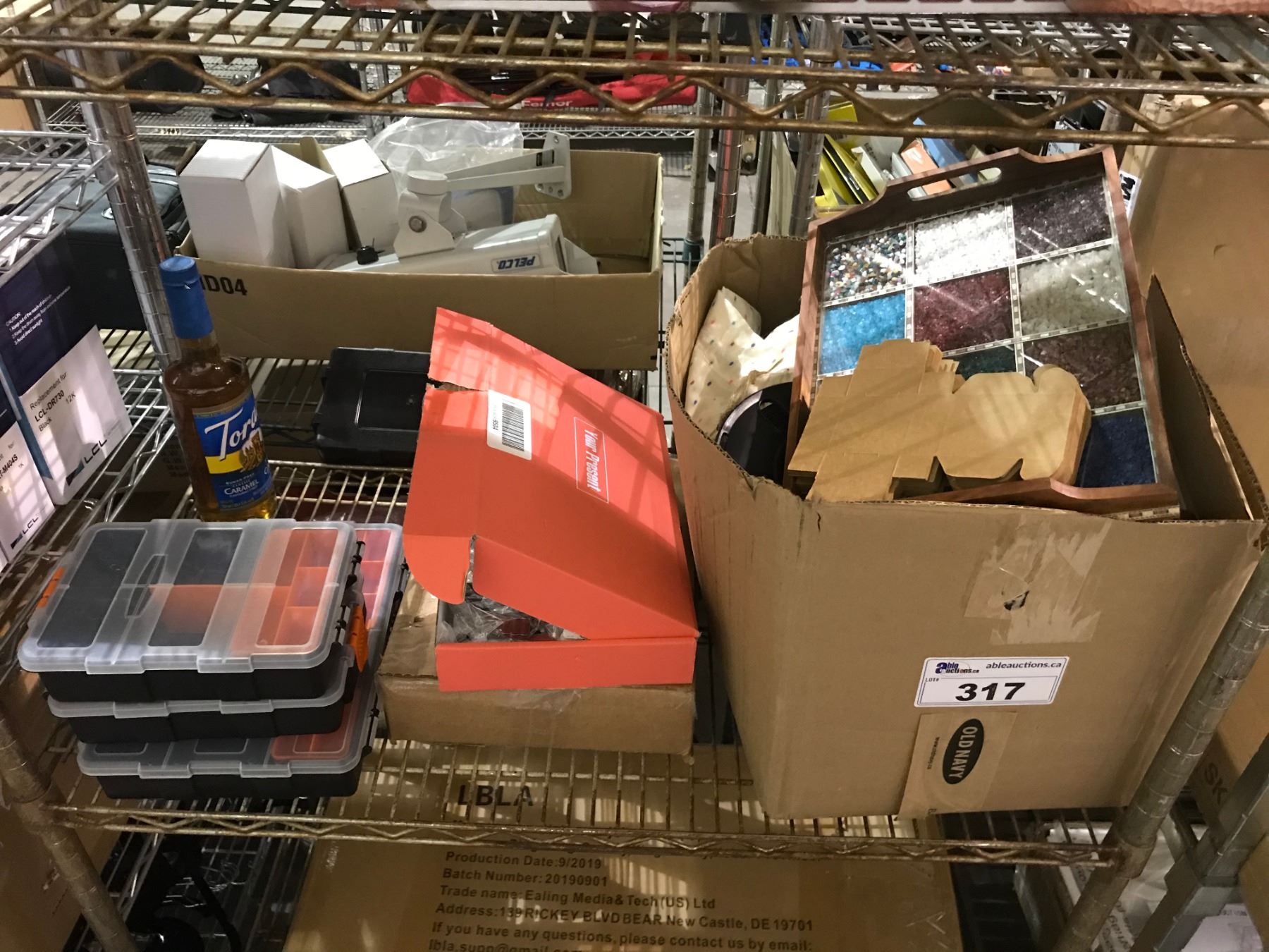 SMALL ORGANIZING BINS, SYRUP, COOKIE CUTTERS, TRAY, GLOVES, CUPS, PHONE REPAIR KITS, ETC