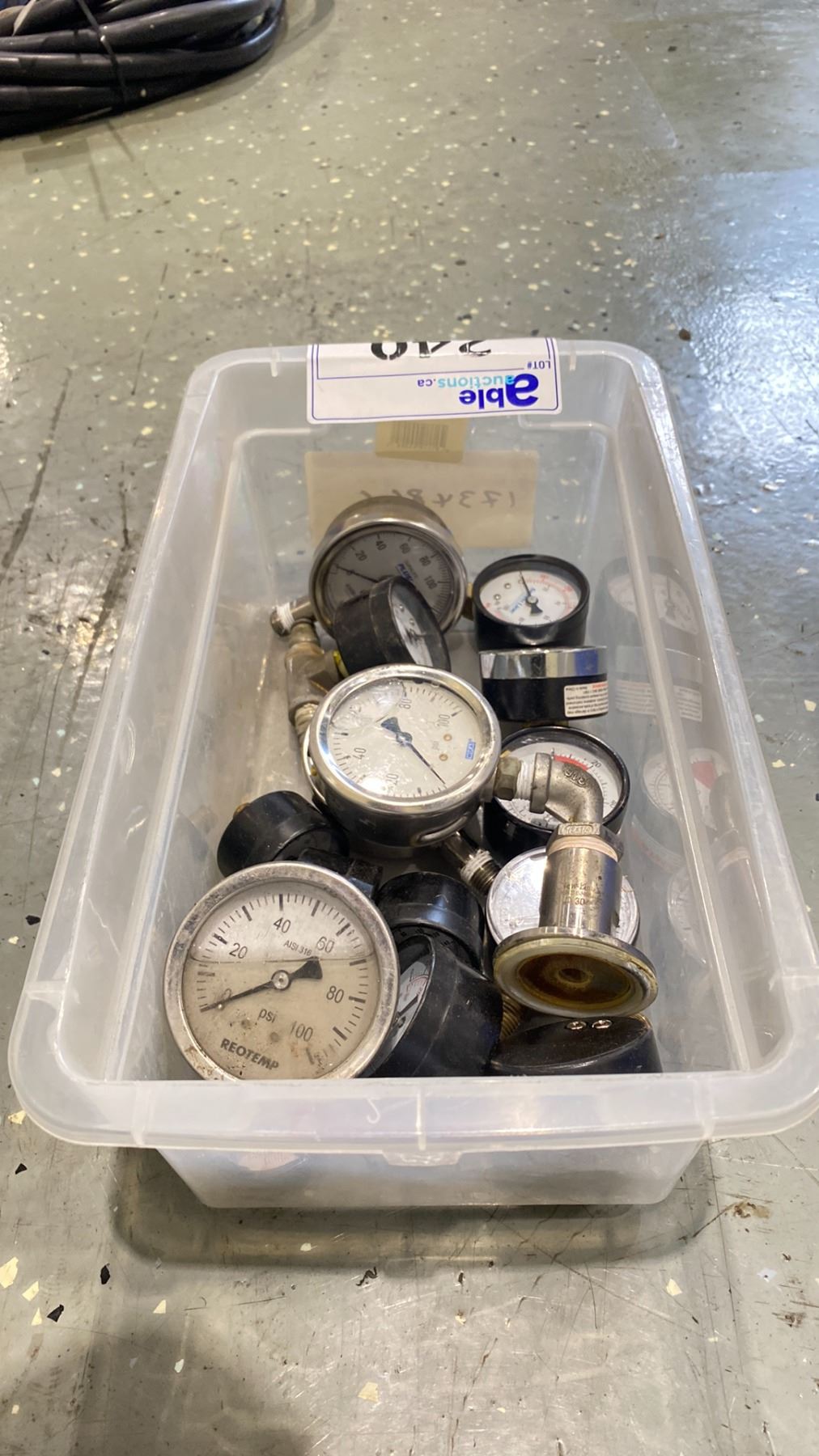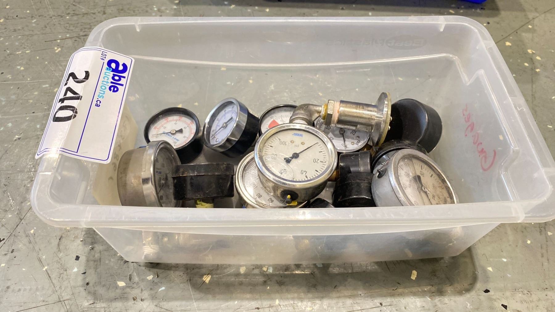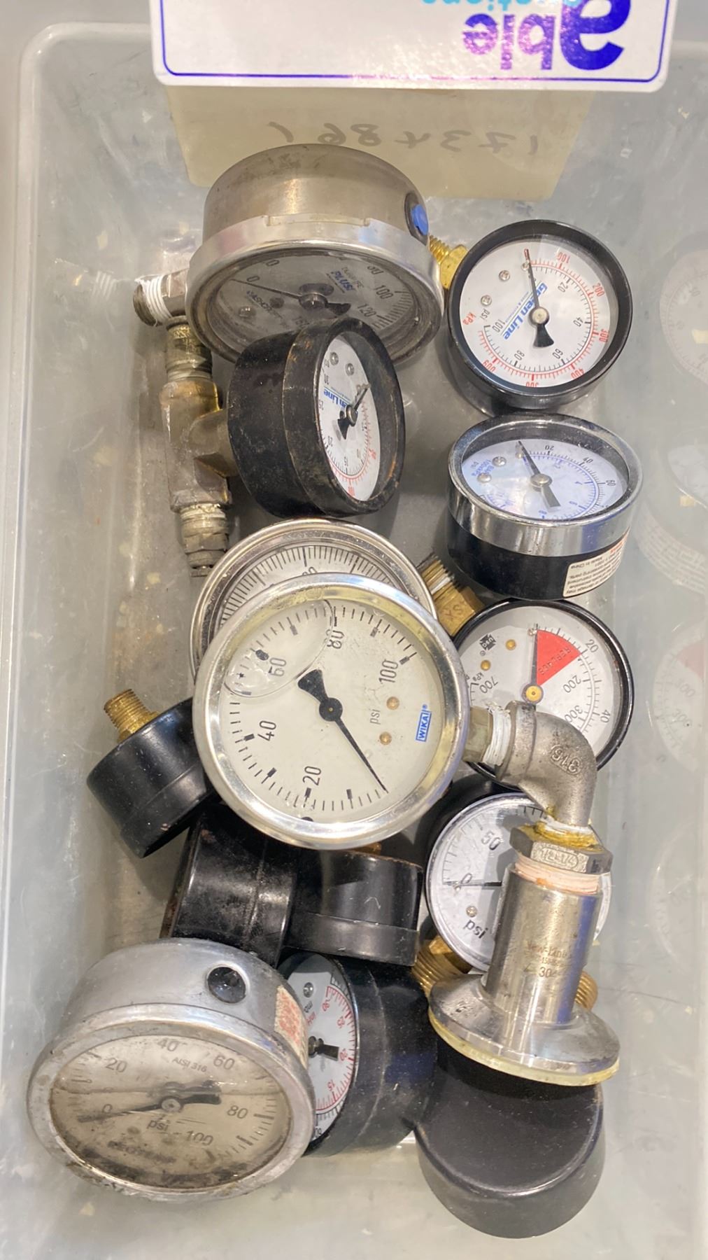 SMALL PLASTIC CONTAINER FULL OF ASSORTED PRESSURE GAUGES