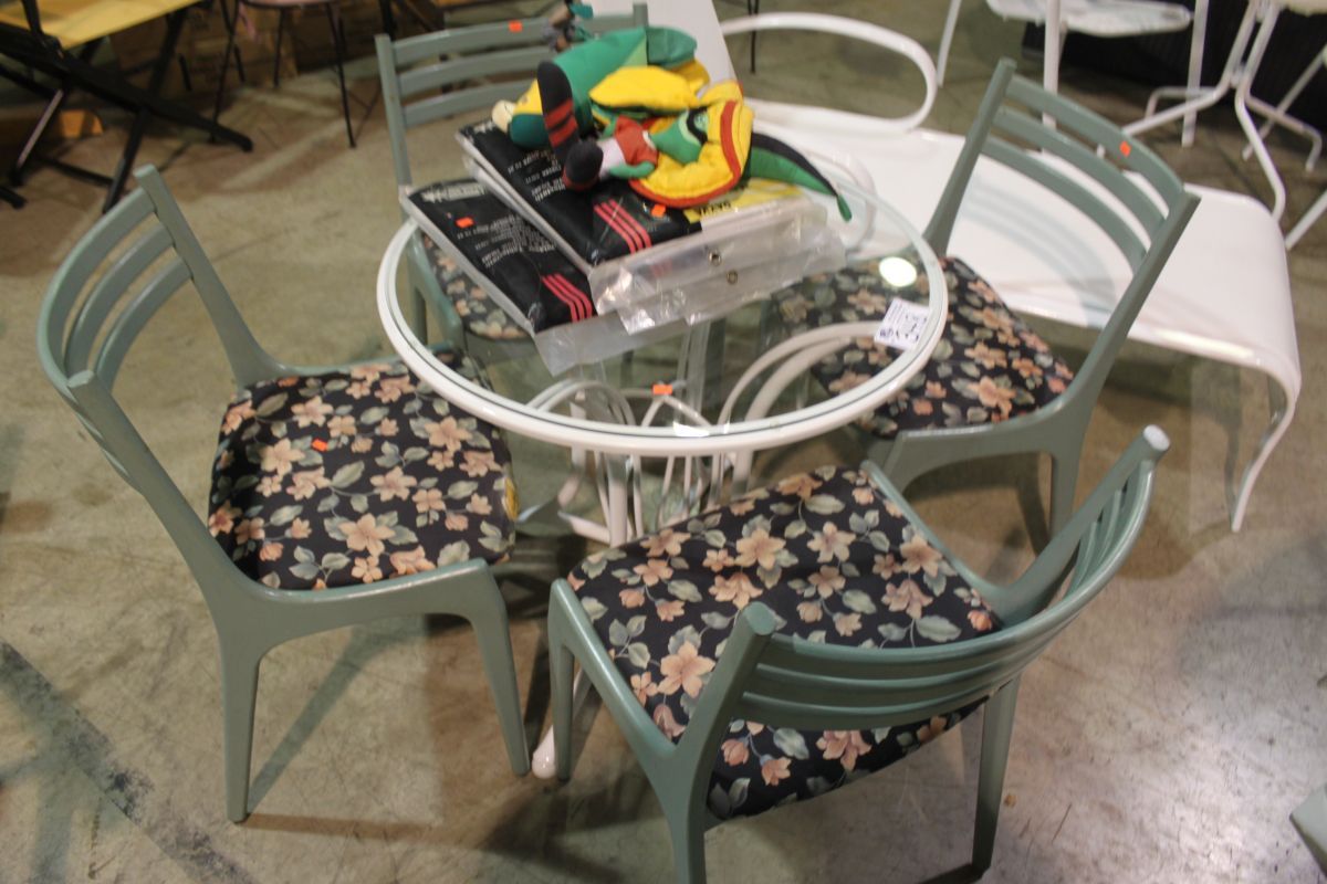 SMALL ROUND GLASS TOP PATIO TABLE WITH 4 CHAIRS, 4 TABLE CLOTHES & TOYS
