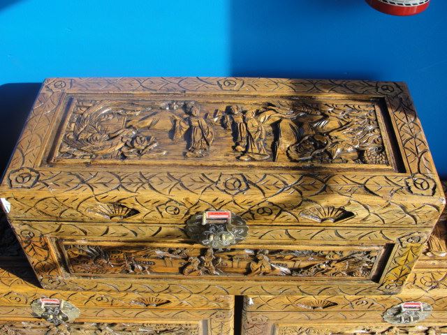 SMALL SIZE HEAVILY CARVED MAHOGANY ORIENTAL TRUNK