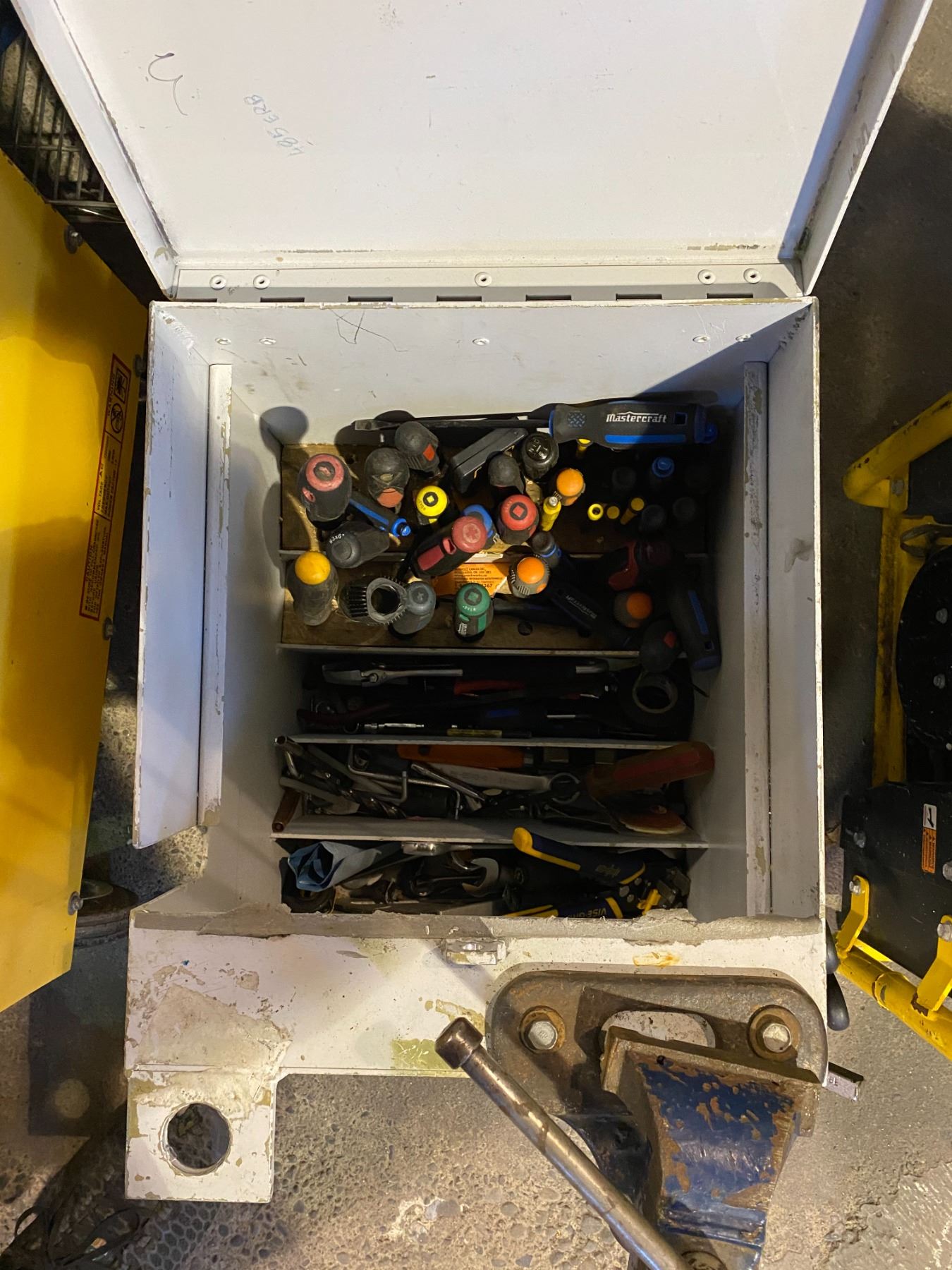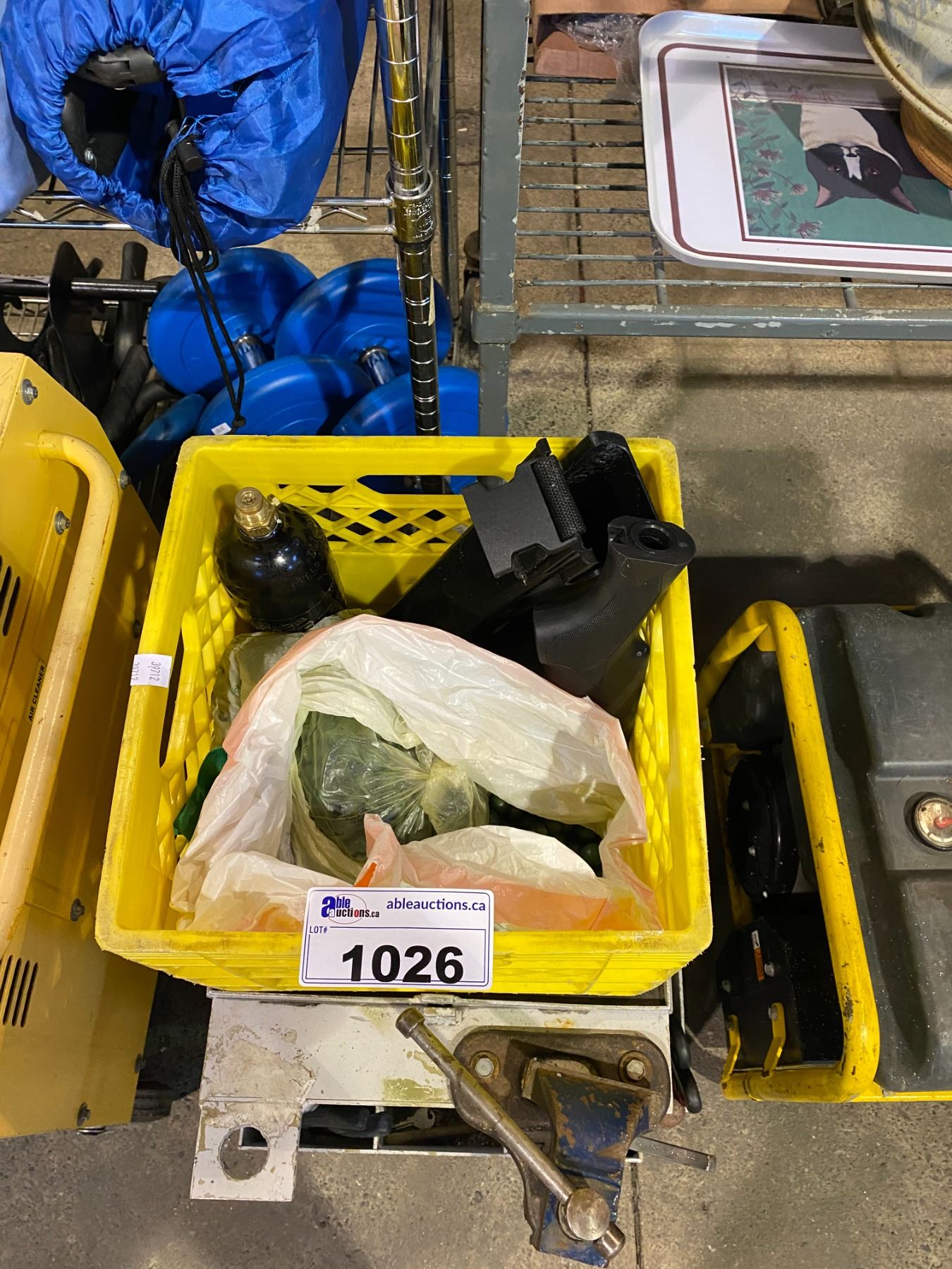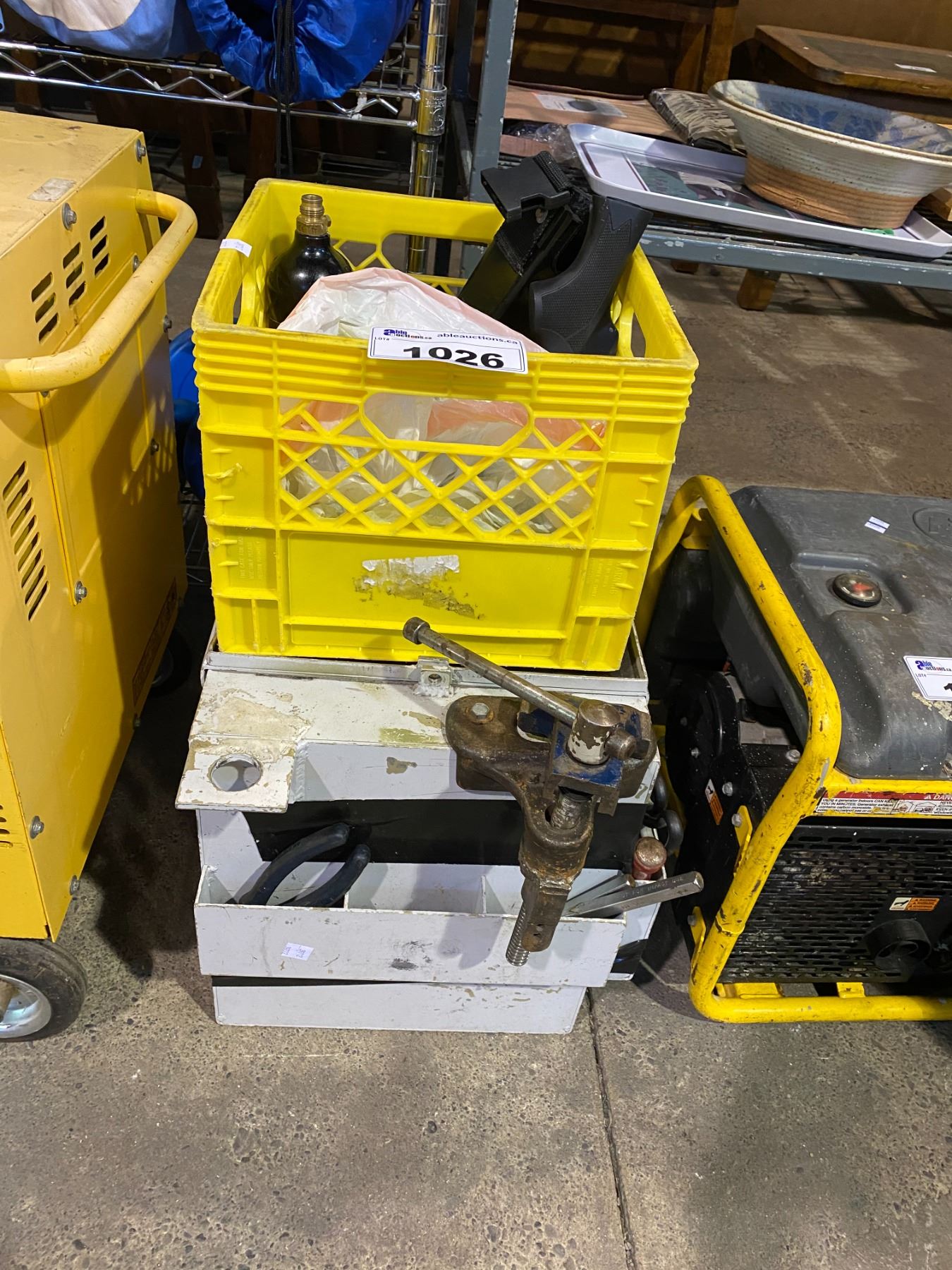 SMALL TOOL BOX WITH BUILT IN VICE & CONTENTS OF TOOLS & CRATE OF PAINTBALL RELATED ITEMS