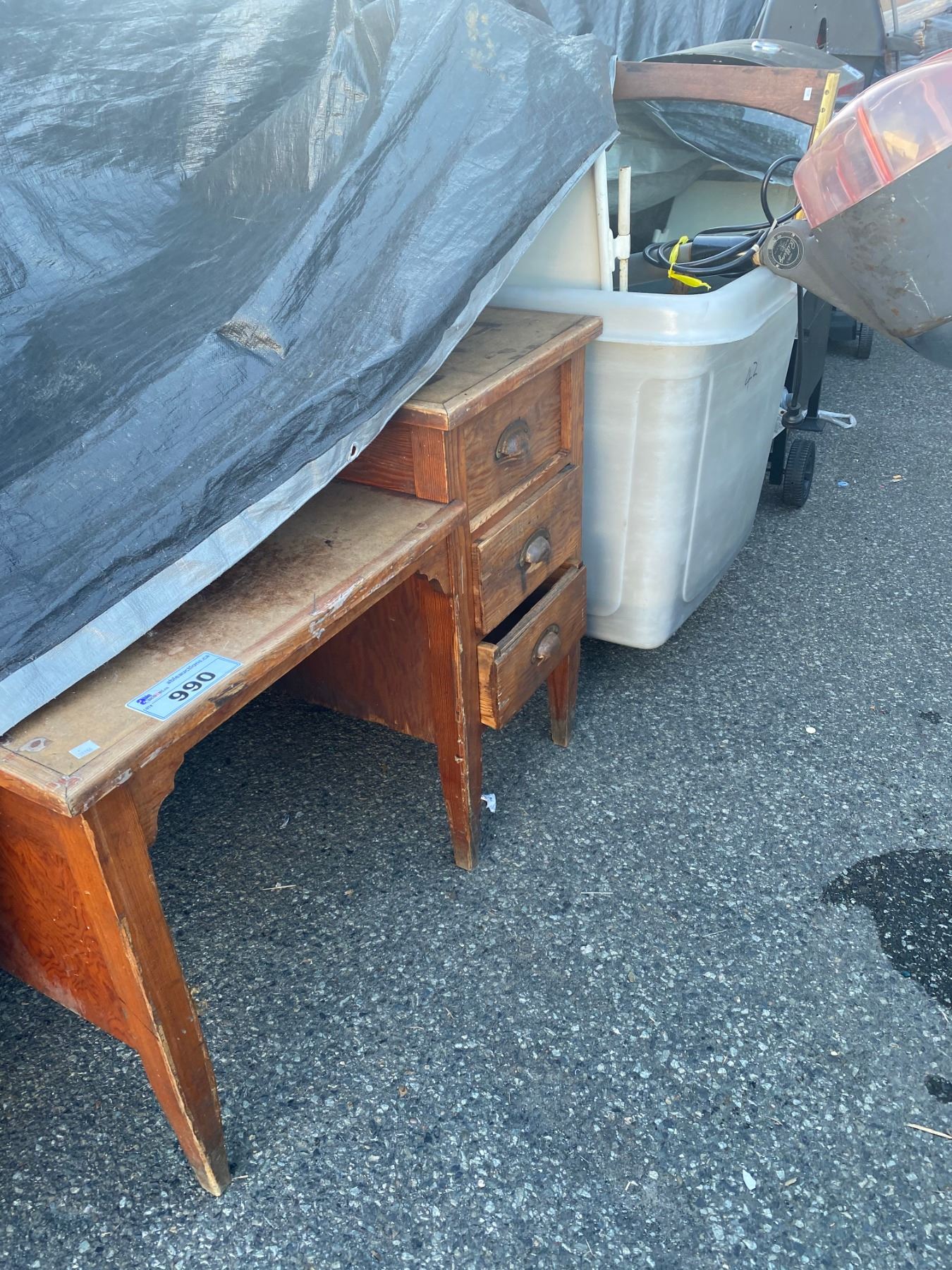 SMALL WOODEN DESK AND BIN OF ANTIQUES (BIN NOT INCLUDED)