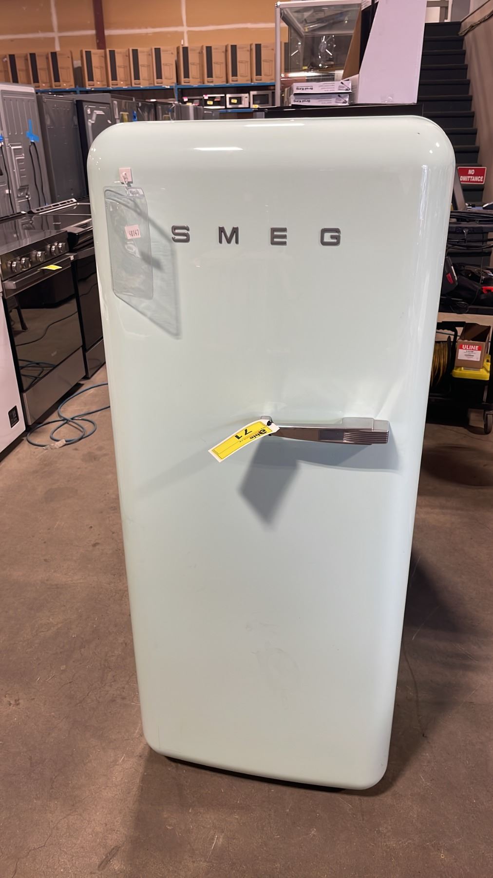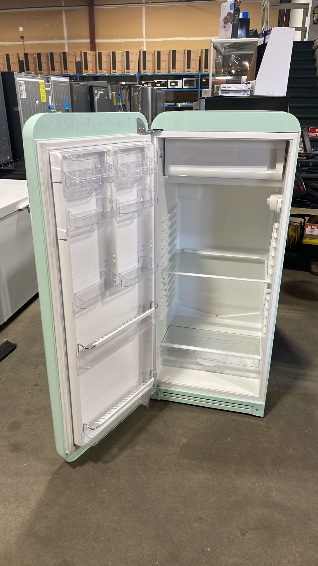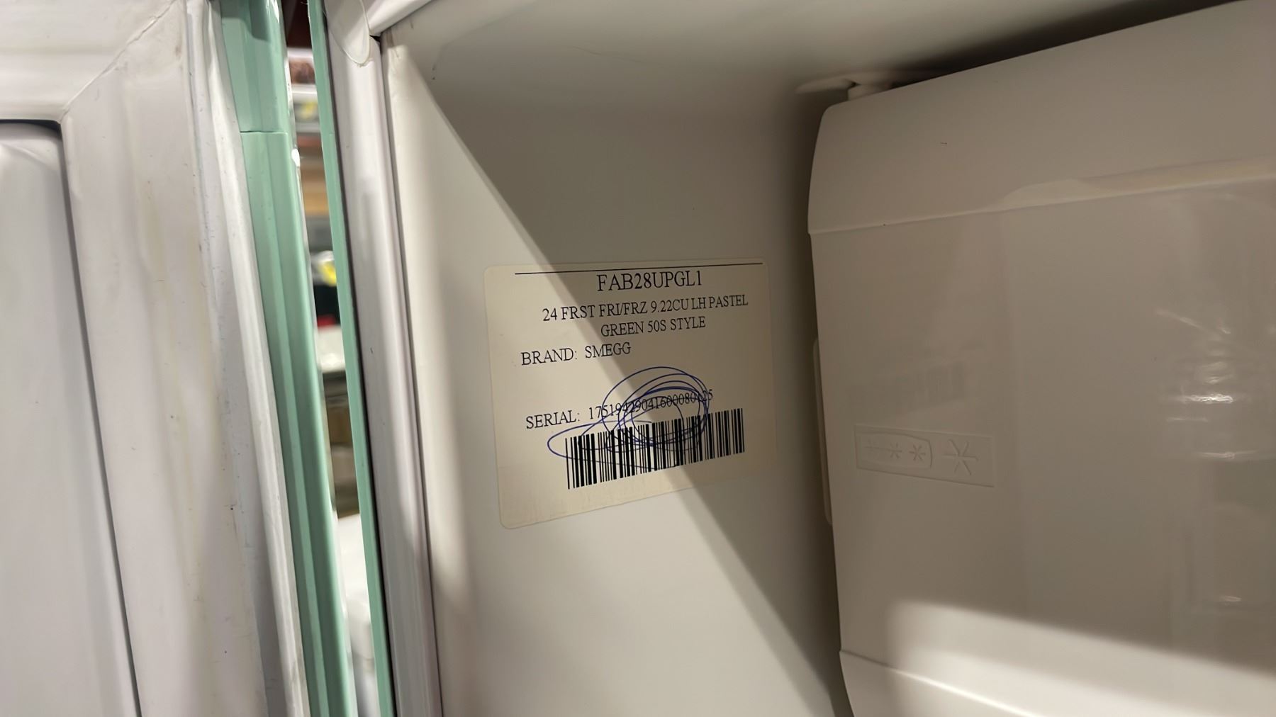 SMEG MODEL FAB28UPGL1. 24" PASTEL GREEN VINTAGE 50'S RETRO DESIGN APARTMENT REFRIGERATOR WINE BOTTLE SHELF, CRISPER DRAWER, FREEZER COMPARTMENT, ADJUSTABLE GLASS SHELVES & DOOR SN 17519427092600270125 RETAIL PRICE $2499.99