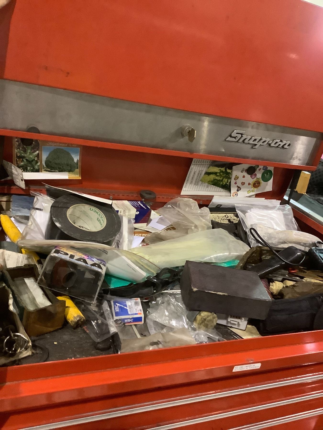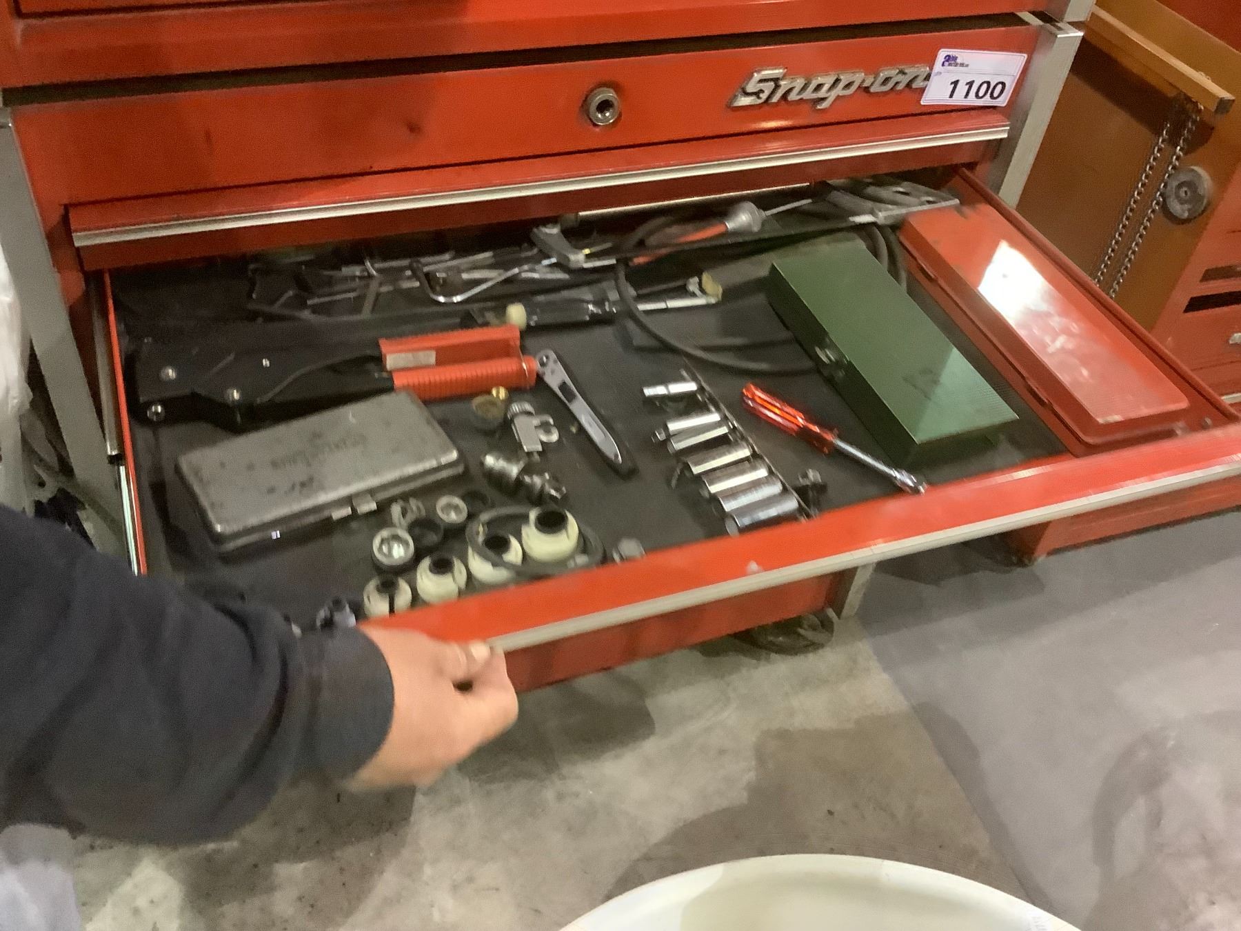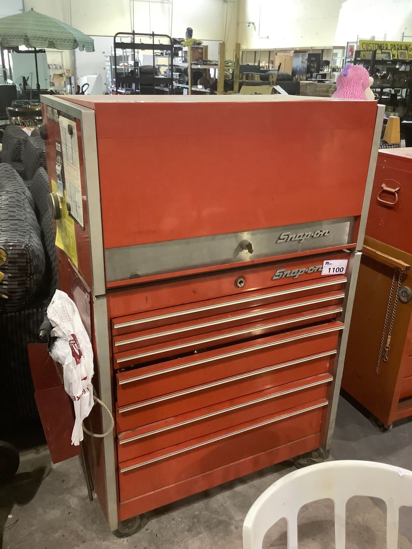 SNAP ON 2 PIECE ROLLING TOOLBOX WITH CONTENTS KEY FOR TOP LOCK, BOTTOM LOCK DRILLED OUT 21.5" X 58" X 35.75"