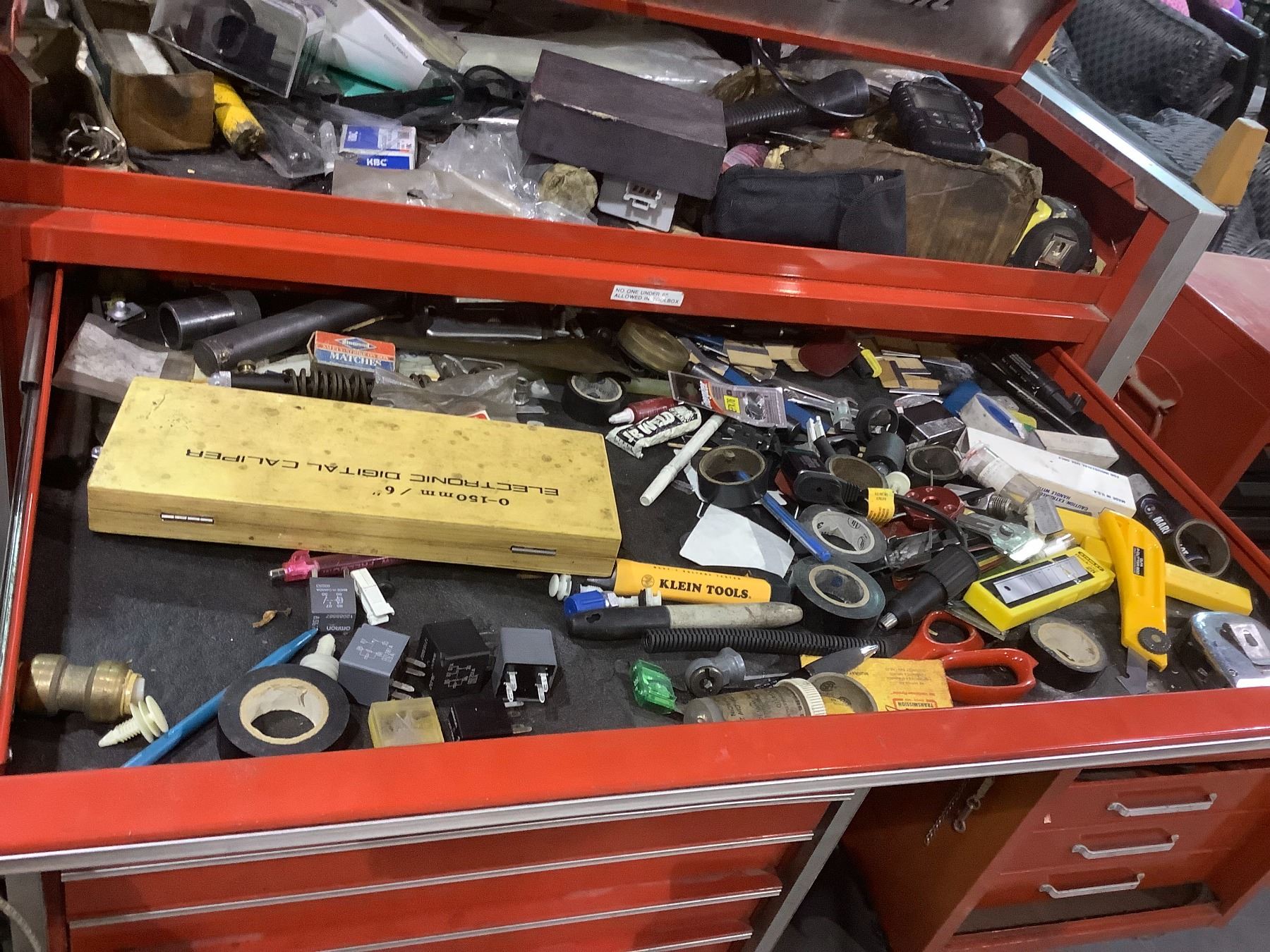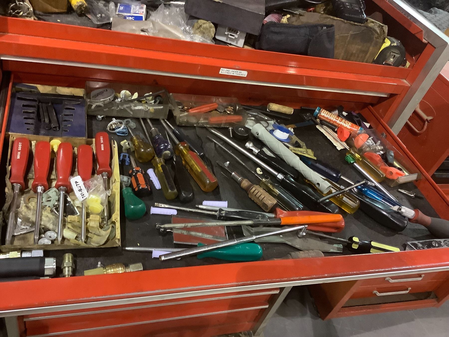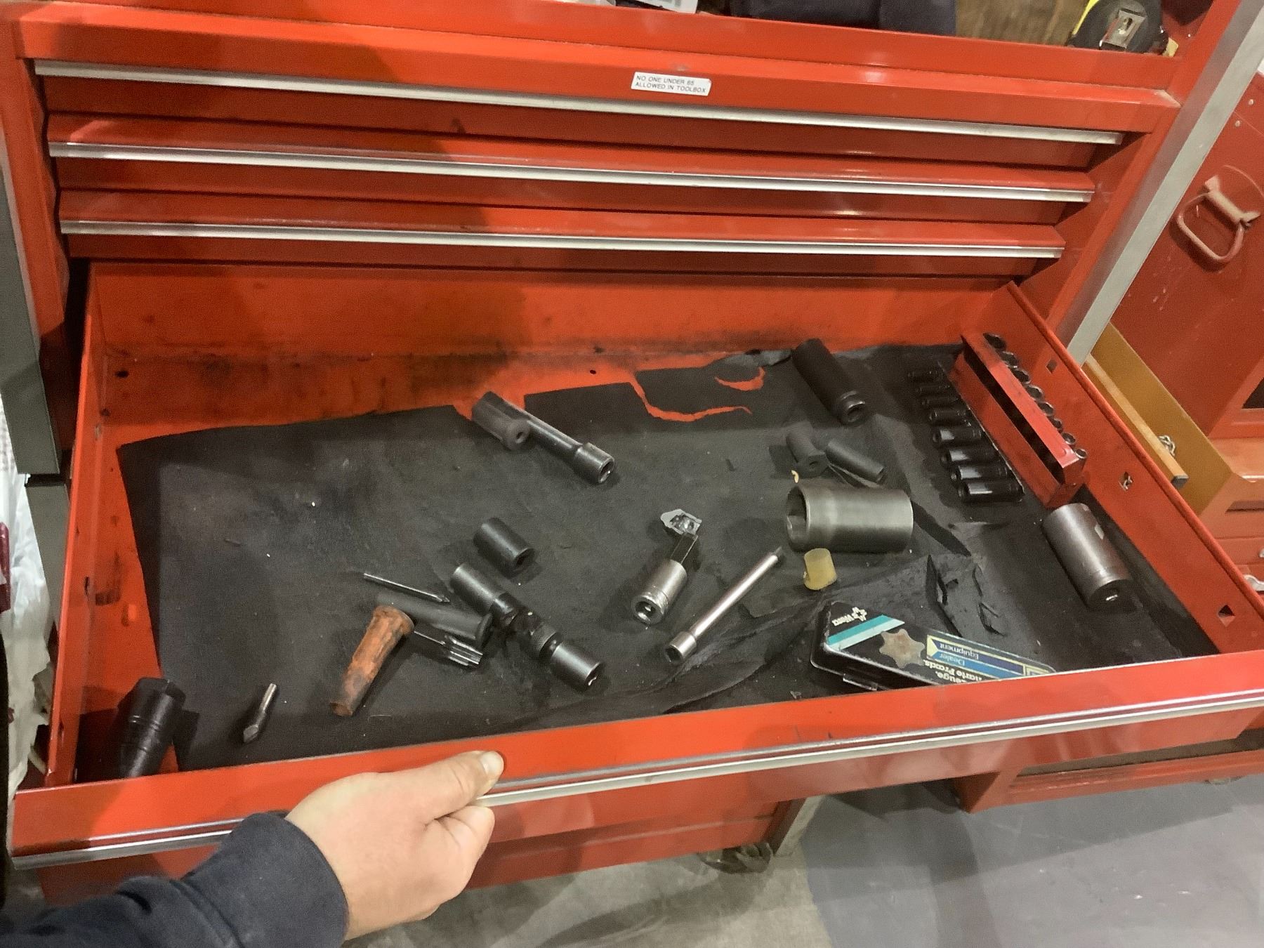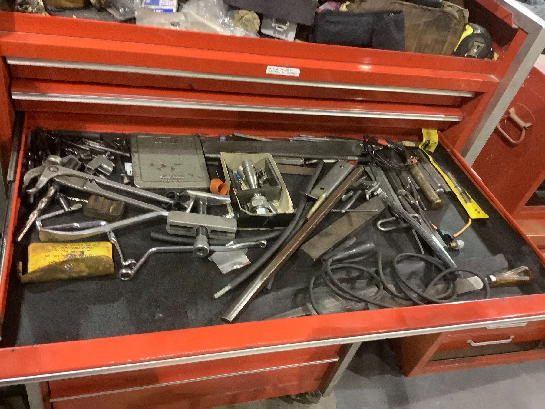 SNAP ON 2 PIECE ROLLING TOOLBOX WITH CONTENTS KEY FOR TOP LOCK, BOTTOM LOCK DRILLED OUT 21.5" X 58" X 35.75"