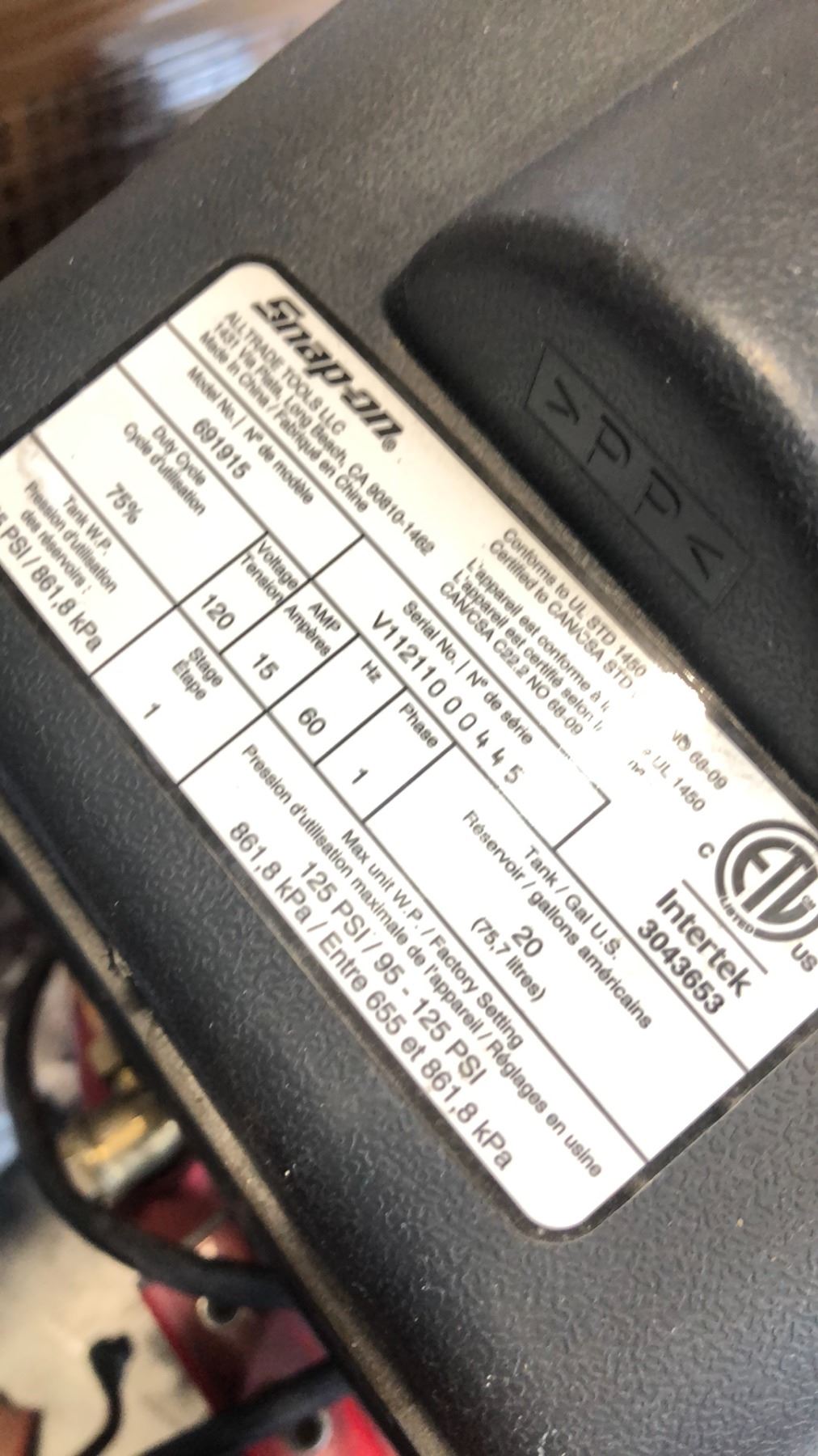 SNAP-ON 20-GAL 125-PSI DUAL-REGULATED CONTROL, UPRIGHT MOBILE COMPRESSOR MDL:691915