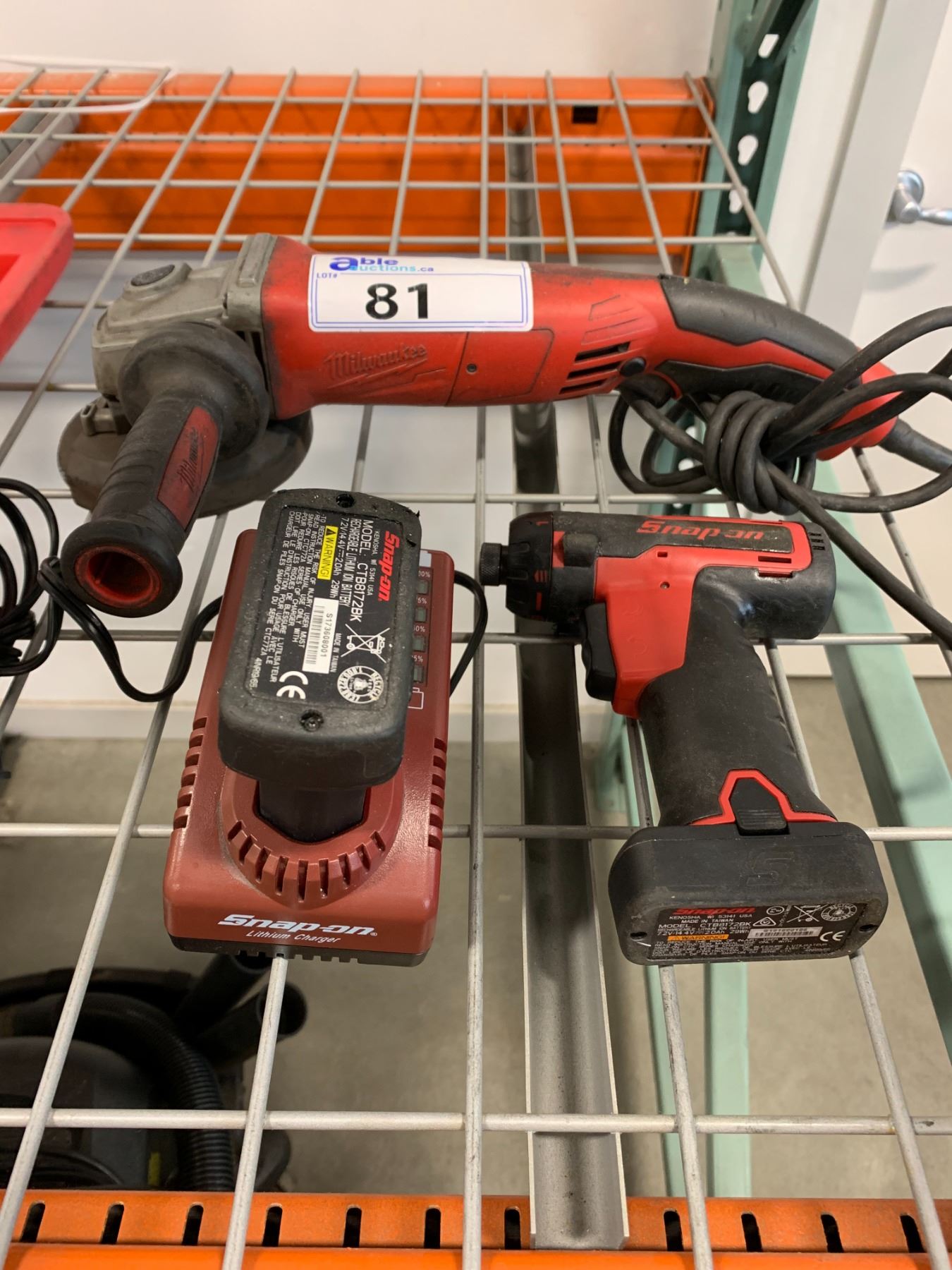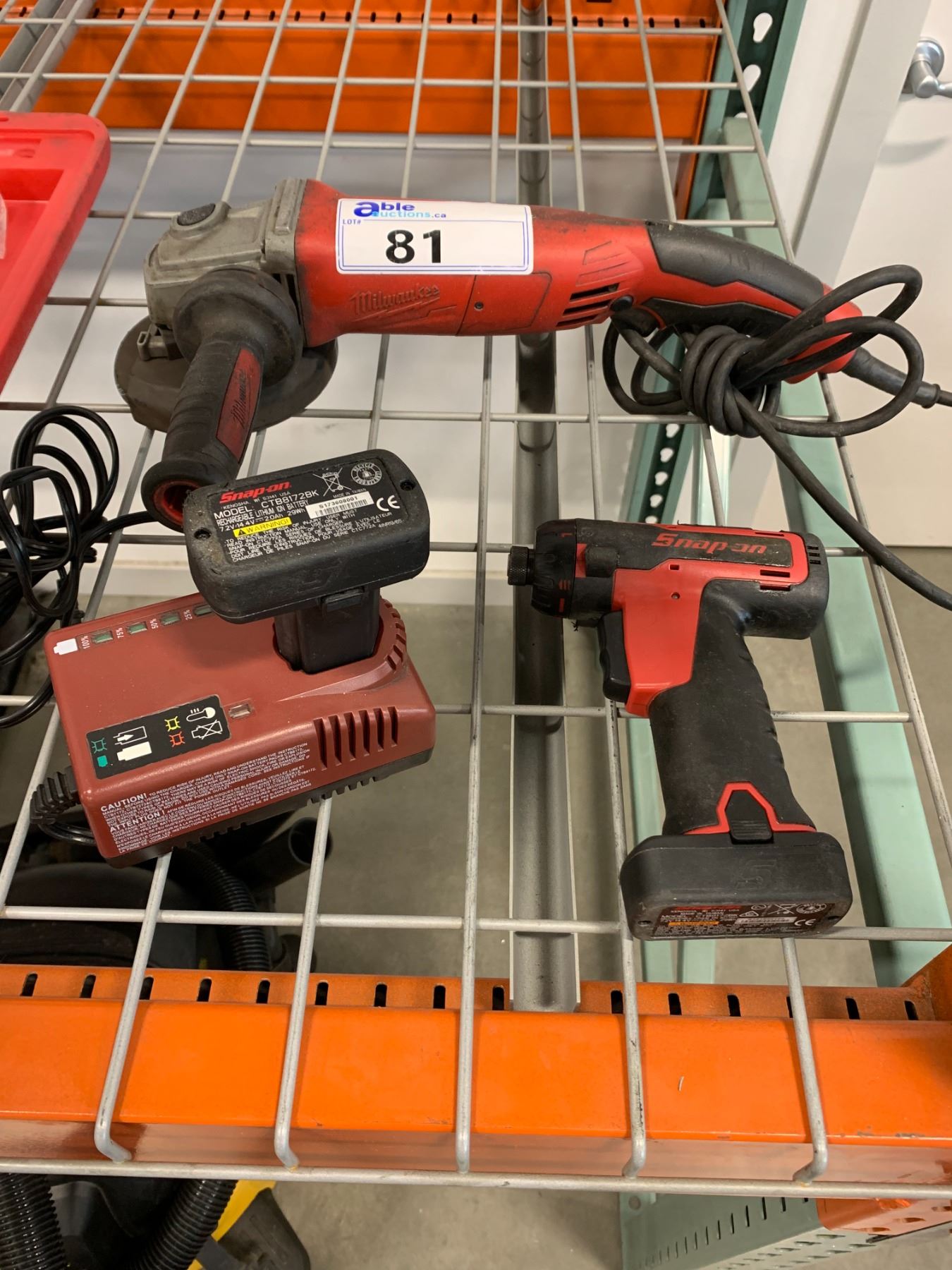 SNAP ON CORDLESS SCREW GUN SET AND MILWAUKEE CORDED GRINDER