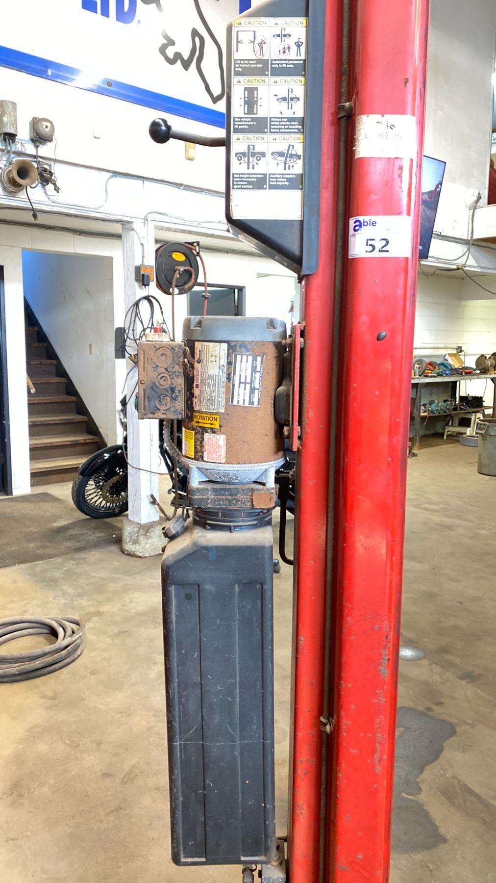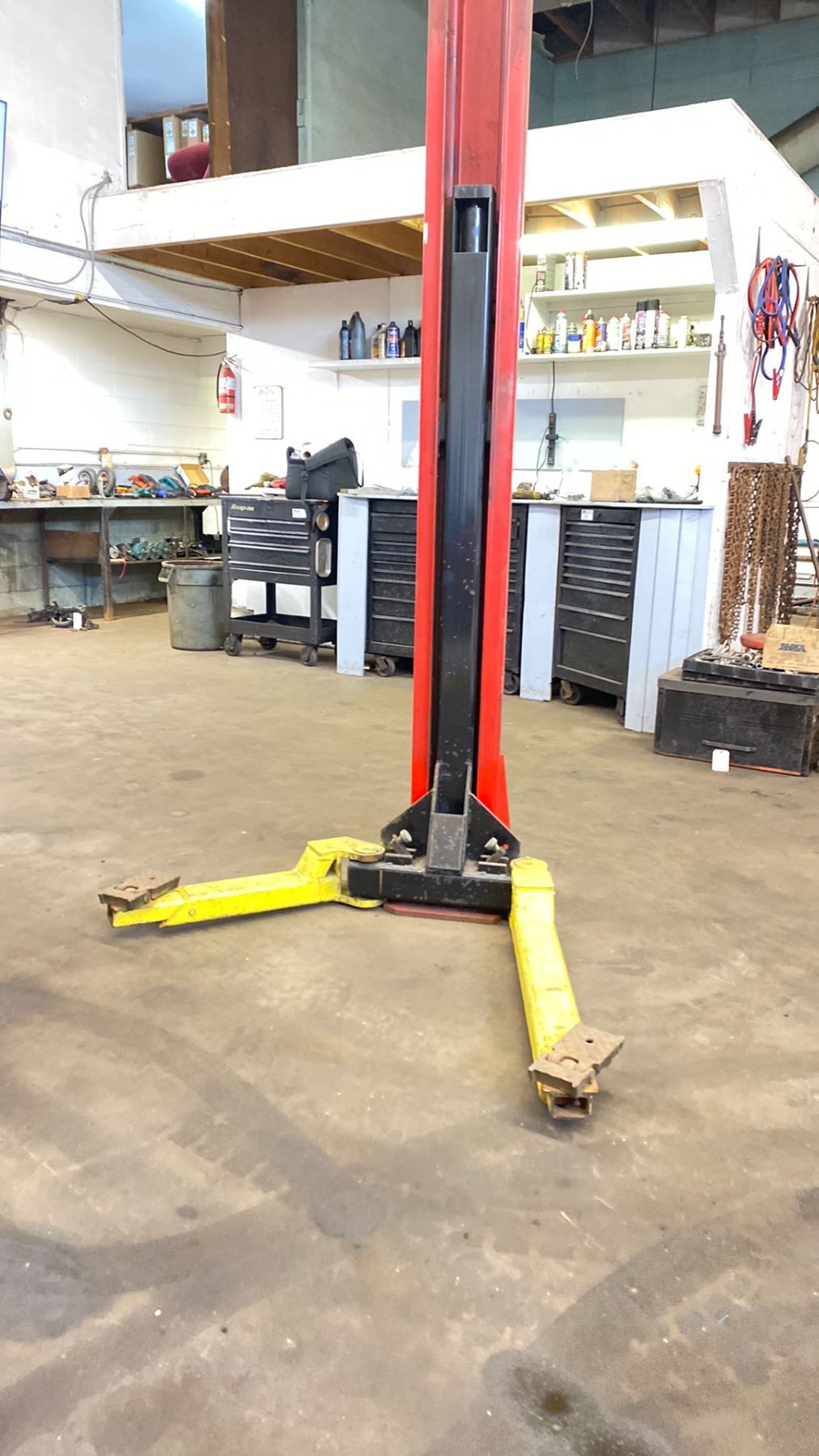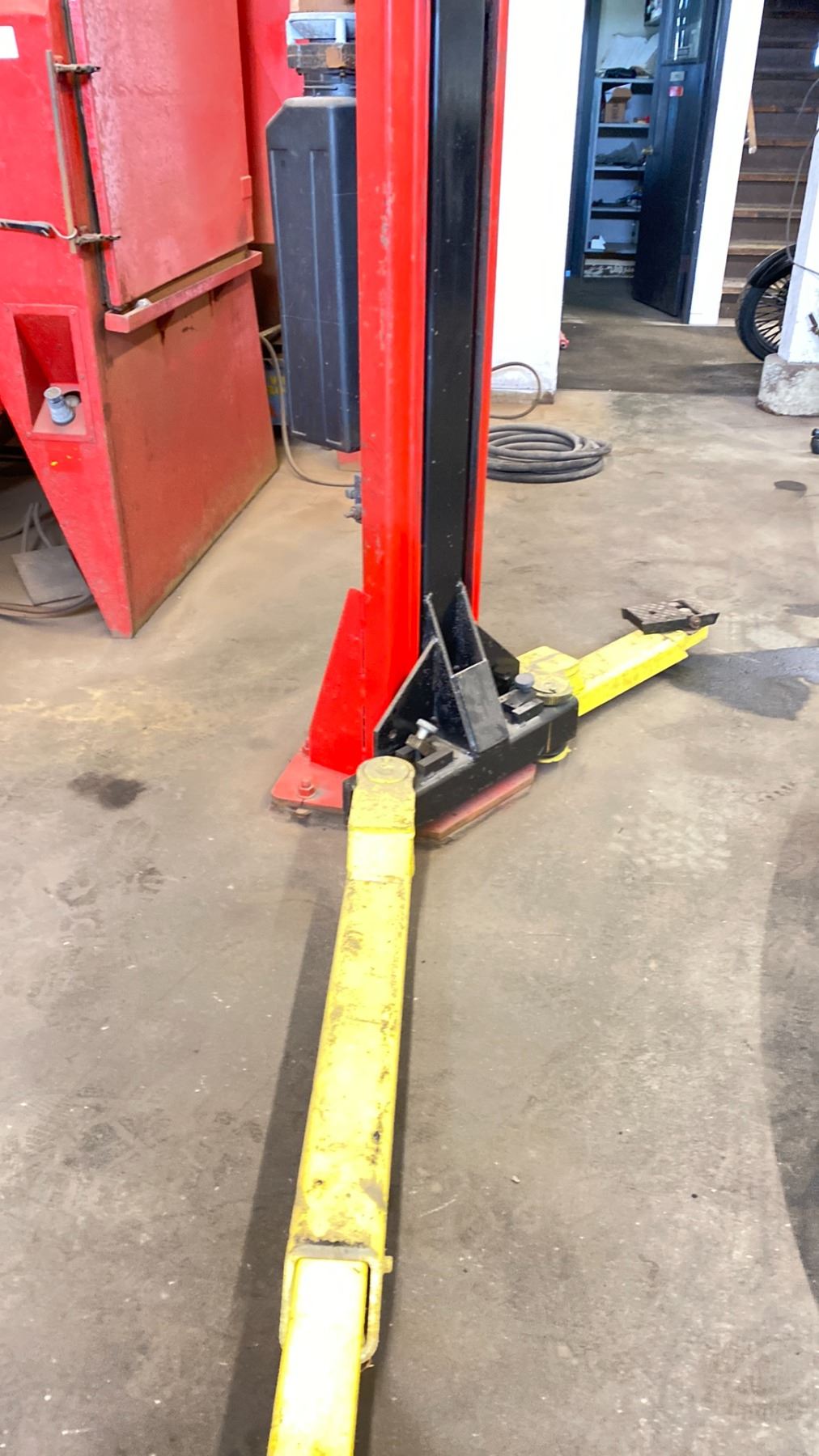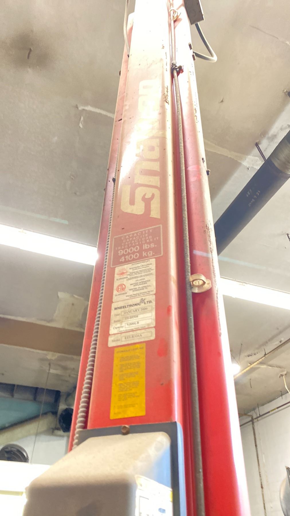 SNAP-ON DOUBLE POST CAR HOIST MODEL EELR326A 9000 LB CAPACITY. ELECTRIC HYDRAULIC. POWER WILL BE DISCONNECTED. PURCHASER REQUIRED TO DISASSEMBLE AND REMOVE. FORKLIFT WILL BE AVAILABLE. OVERALL MEASUREMENT 137"X 145" HIGH