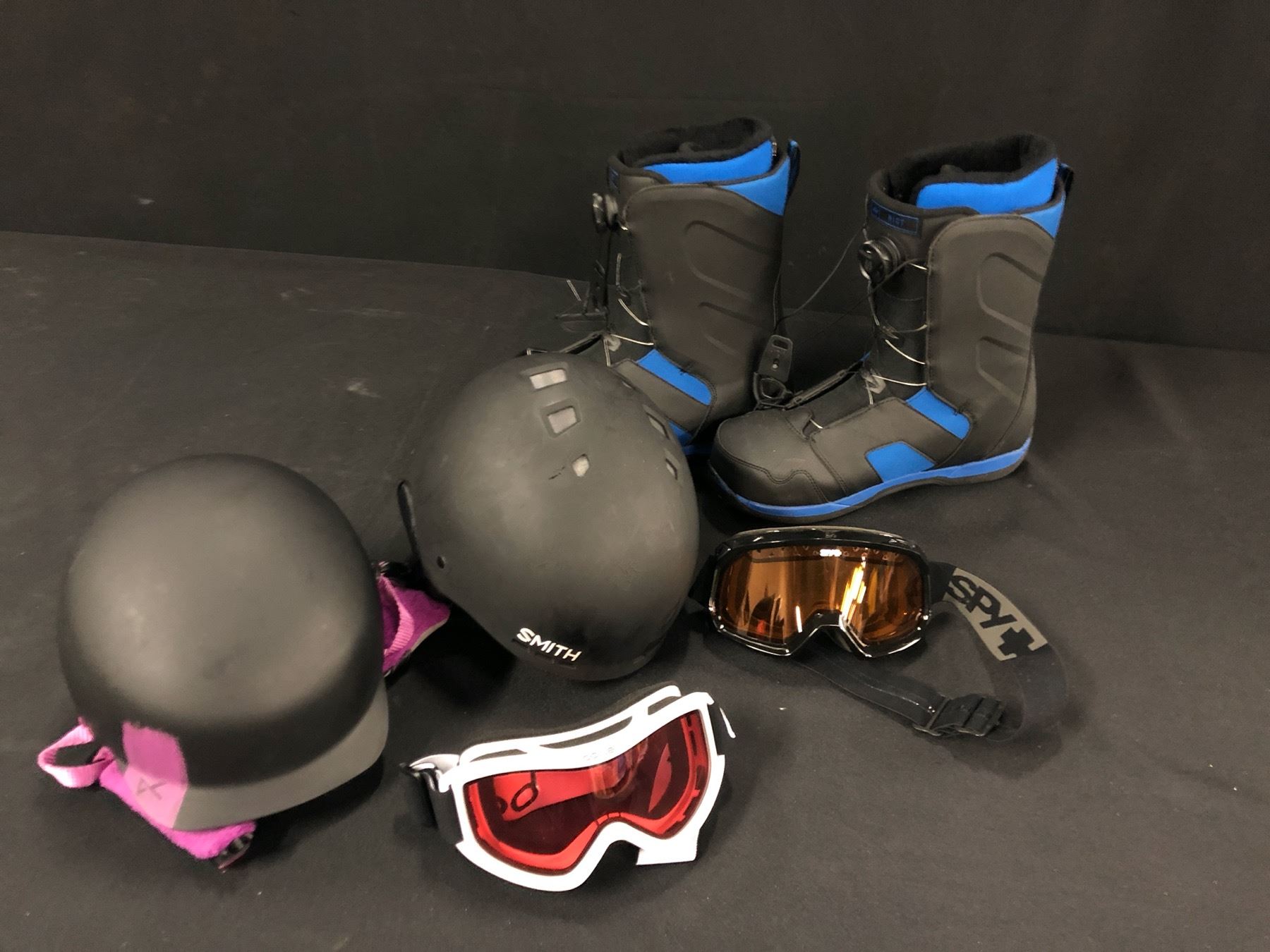 SNOWBOARD GEAR INC. PAIR INTUITION SIZE US 13 BOOTS, SMITH MEDIUM SIZE HELMET, AERA MEDIUM SIZE HELMET, BOLLE & SKY+ GOGGLES