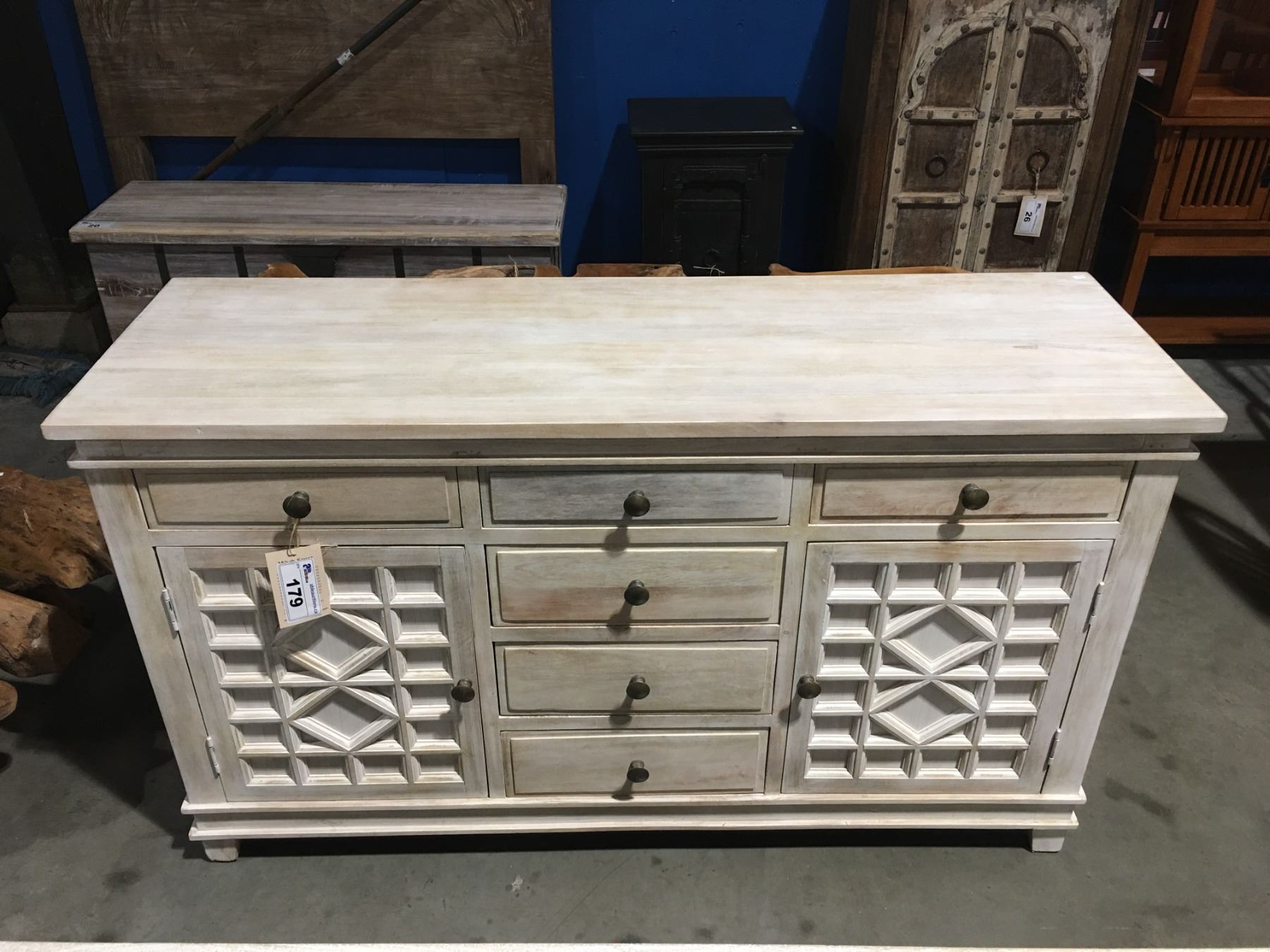 SOLID TEAK WHITE WASH CARVED 2 DOOR/6 DRAWER BUFFET