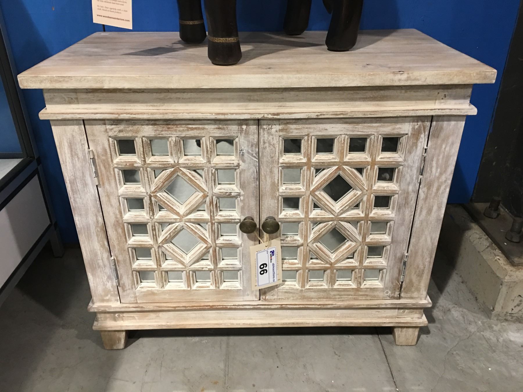 SOLID TEAK WHITE WASH CARVED & MIRROR FITTED 2 DOOR CABINET