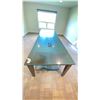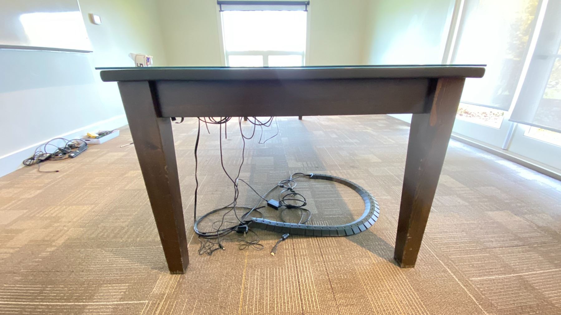 SOLID WOOD BOARDROOM TABLE 10'X42" WITH GLASS TOP AND WIRE MANAGEMENT LOCATED IN HOUSE