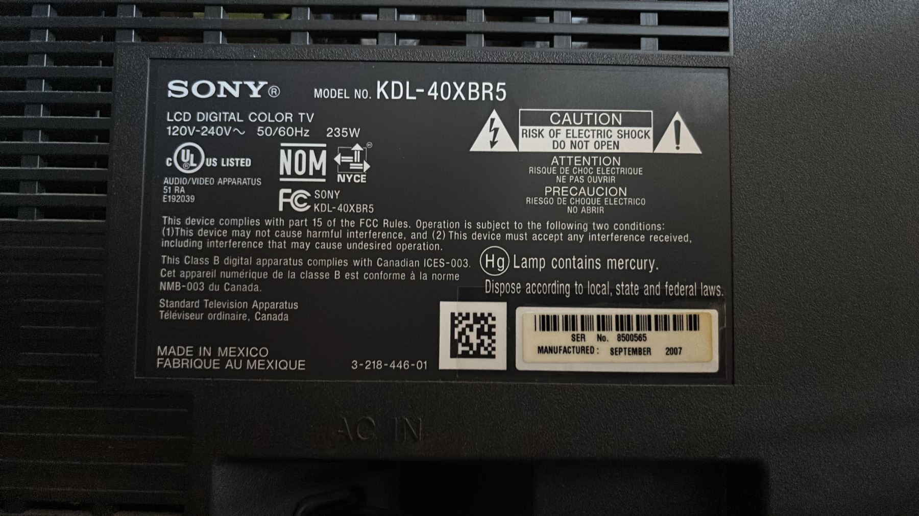 SONY 40" TELEVISION WITH POWER CORD *NO REMOTE*