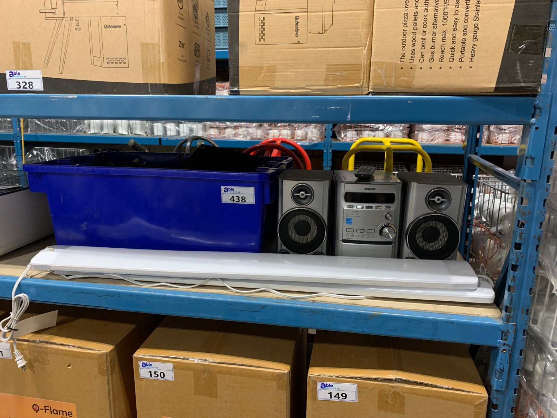 SONY 5 DISC STEREO SYSTEM W/REMOTE, 2- 4' MOUNTING LIGHT BARS, LOREX 1080P HD RECORDER, BIN OF