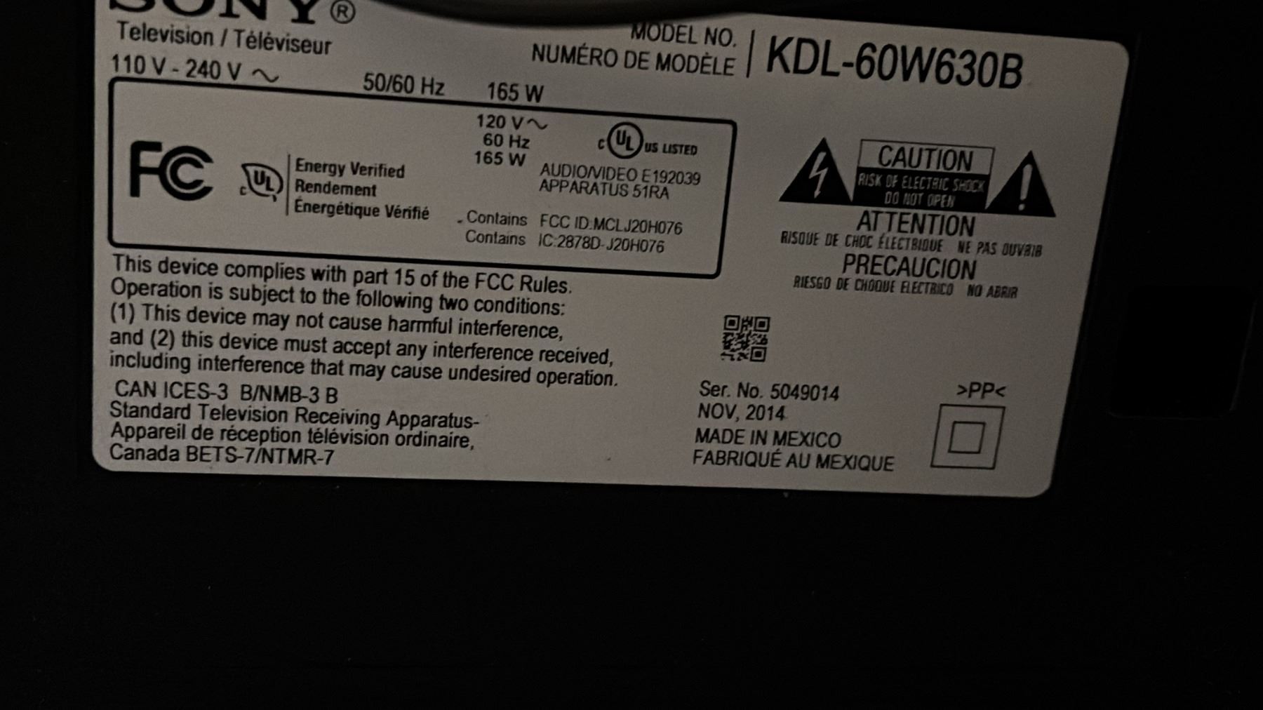 SONY 60" TELEVISION WITH POWER CORD *NO REMOTE/NO STAND*